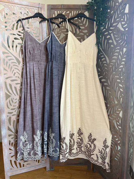 Abito Lungo Flora Embroidery in Misto Lino con Ricamo Sangallo - In 3 Colori