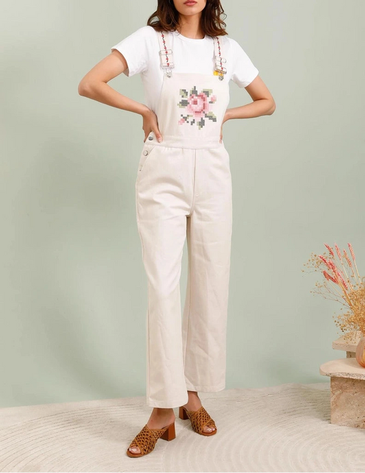 Salopette in Cotone Boho-Chic con Ricamo Floreale Pixel