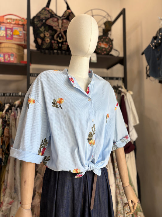 Camicia Over Azzurra a Micro-righe con Ricami Floreali