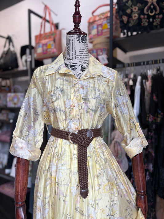 Abito Chemisier Midi Giallo con Fantasia Floreale e Cintura Intrecciata Inclusa