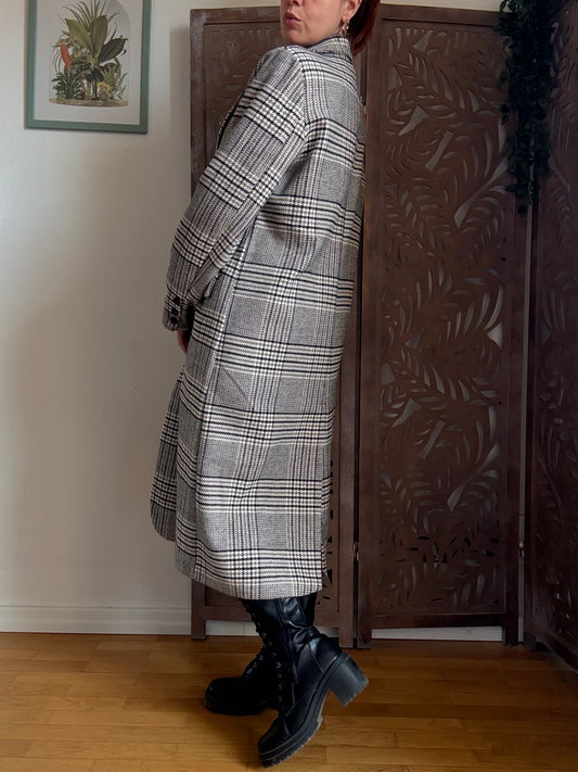Cappotto College lungo grigio a quadretti in cotone con spille
