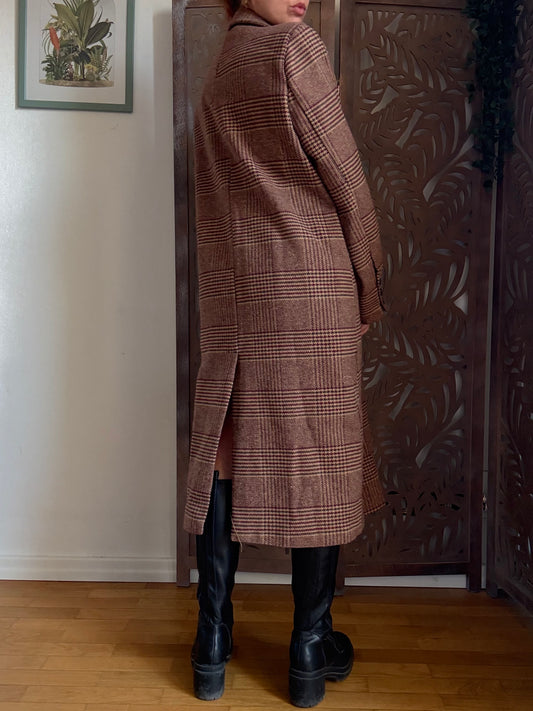 Cappotto College lungo bordeaux a quadretti in cotone con spille