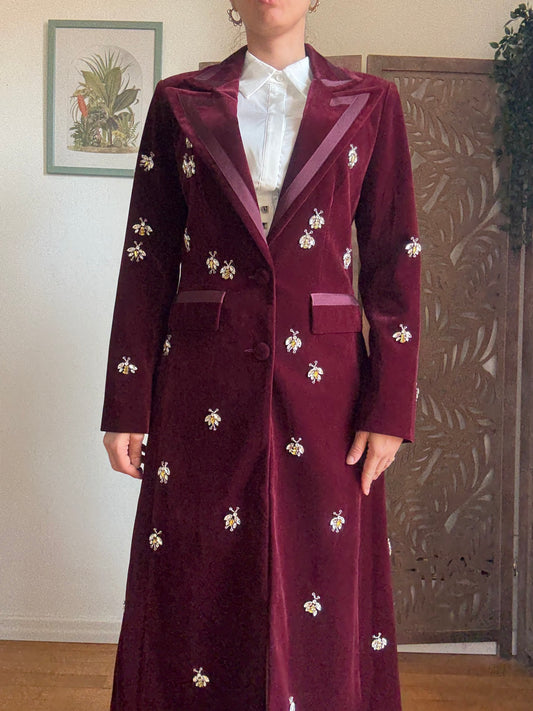 Cappotto lungo bordeaux aderente in vita con dettagli gioiello