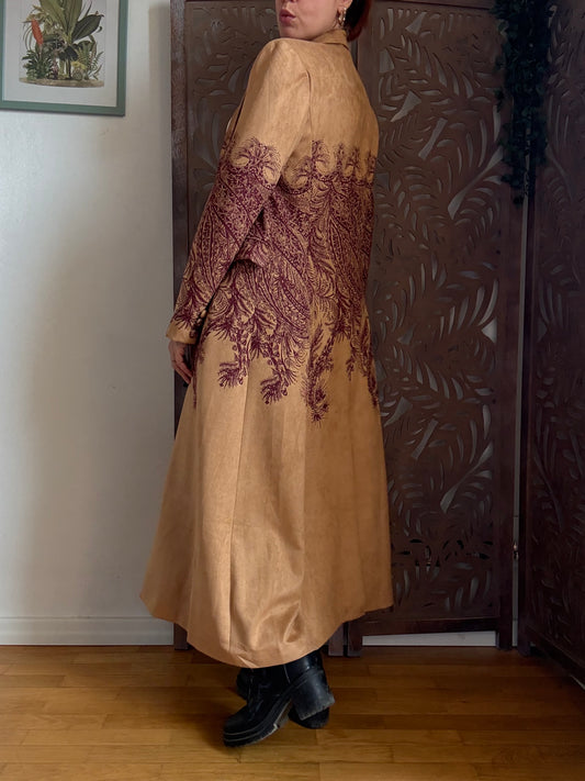 Soprabito lungo scamosciato cammello aderente in vita con fantasia floreale bordeaux