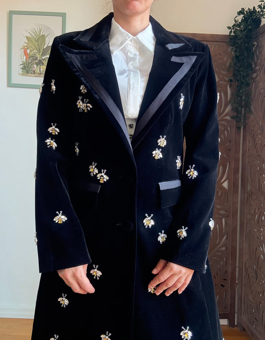 Cappotto lungo nero aderente in vita con dettagli gioiello