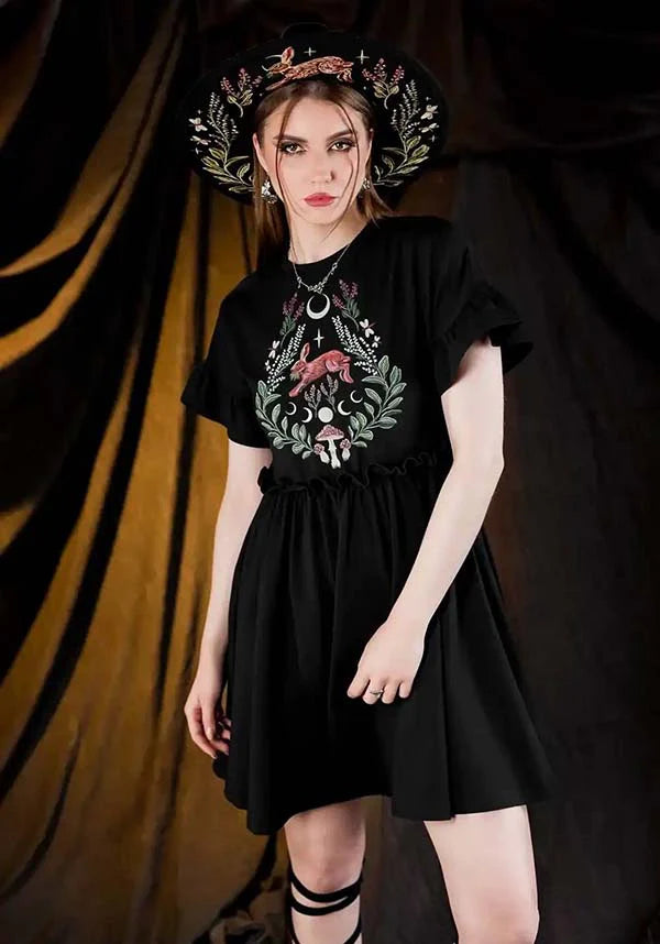 Sei pronta per un'avventura nel bosco al chiaro di luna? Questo mini abito, giocoso ma misterioso, ti avvolge in una magia botanica. Lepri che saltano, foglie del sottobosco, funghi, fiori, fasi lunari, stelle e libellule: ogni elemento evoca l'incanto delle foreste notturne. Comodo e squisitamente "witchy", fonde il fascino dark boho con uno stile forestcore stravagante. È l'abito mini whimsigoth perfetto per le streghe moderne e per chi ama la moda magica ispirata alla natura.