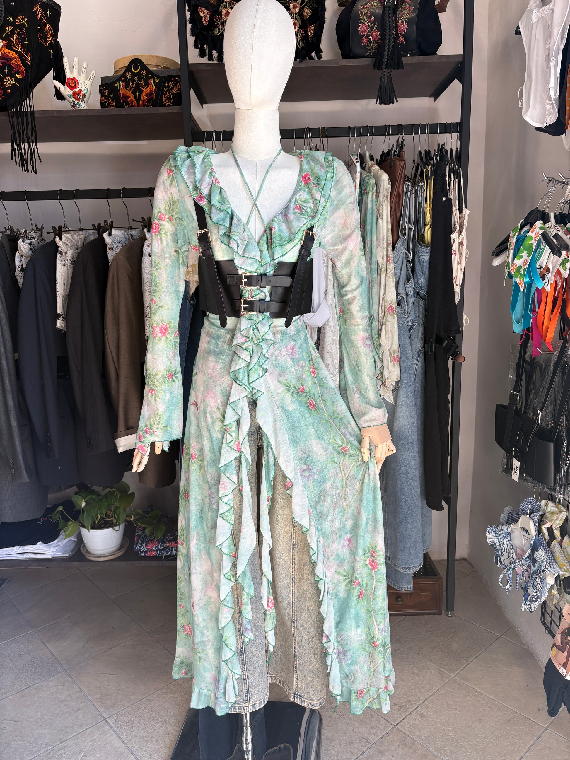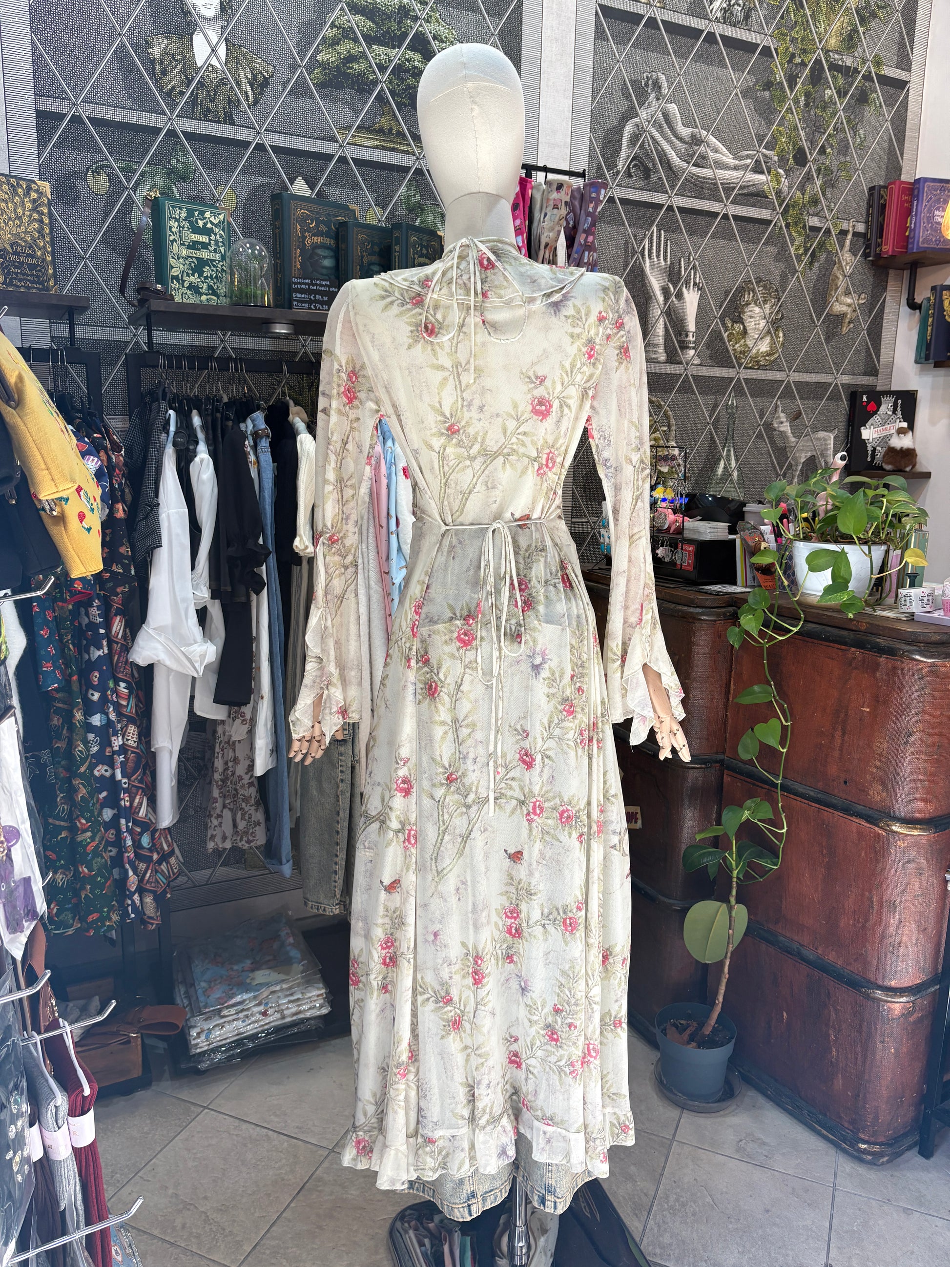 Trasforma il tuo outfit con questo capo versatile e scenografico. Realizzato in un leggerissimo mesh trasparente, questo abito-spolverino presenta una stampa botanica delicata con rose rosa, farfalle e colibrì. Ha due laccini frontali da poter indossare legati sullo scollo oppure al collo incrociati, per più originalità, e due sul retro per rendere più aderente in vita l'effetto.