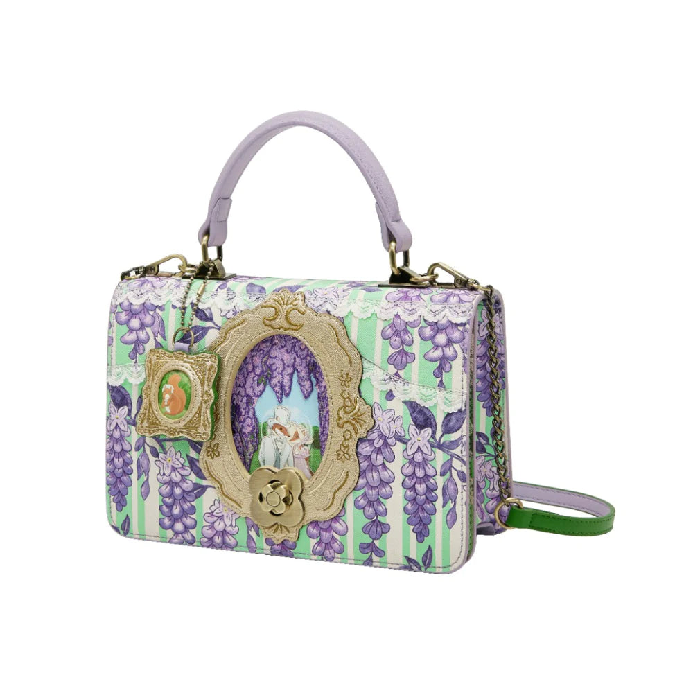 Ovunque tu passeggi, porta con te un tocco di fascino Regency! La desideratissima Borsa Cassie - Regency Gardens è una splendida borsa a mano che dona un’eleganza naturale ovunque tu vada. Contiene tutto ciò che ti serve per una giornata o una serata fuori, ed è ancora più sicura grazie alla chiusura girevole a fiore. A mano o a spalla, completa i tuoi look con un’illustrazione raffinata: una cornice ornamentale che svela il Lord e la Lady. La compagna perfetta per chi ama un accessorio con una storia in più.