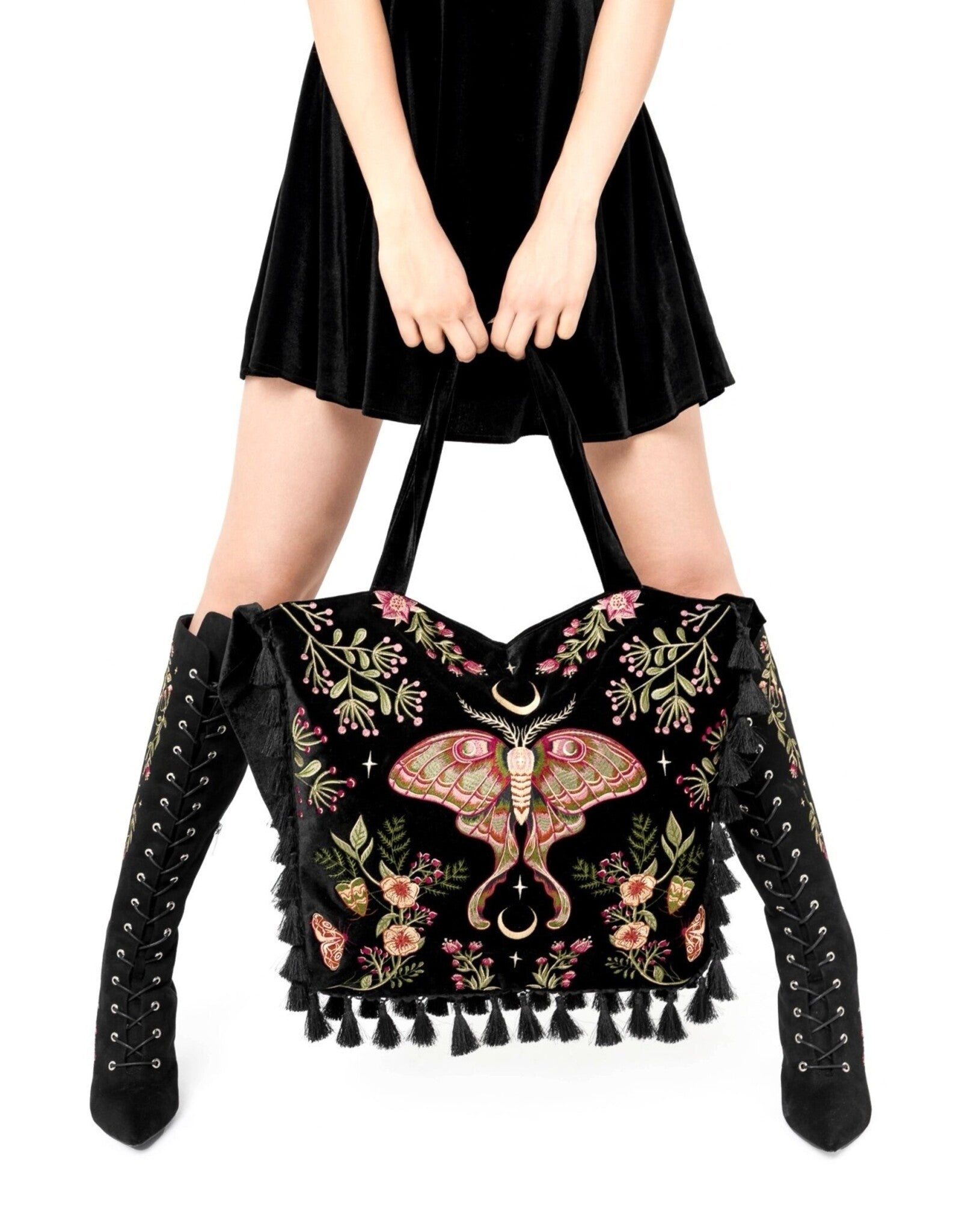 Questo è il pezzo che non passa inosservato, quello capace di far girare la testa a chiunque. Il velluto sontuoso, i ricchi ricami botanici con maestose falene e le rifiniture con nappe lo rendono un oggetto uscito direttamente da una fiaba incantata.