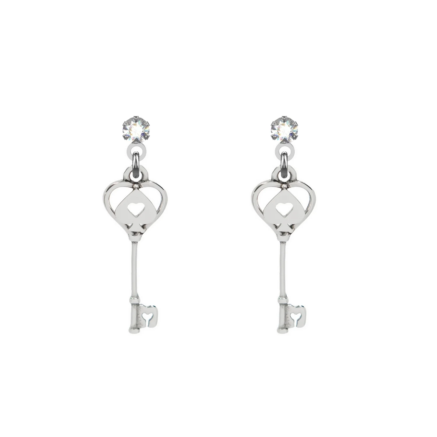 Orecchini con piccole chiavi pendenti caratterizzate da un cuore e una picca che unendosi formano il simbolo del magico mondo di Wonderland. Montatura con cristalli.