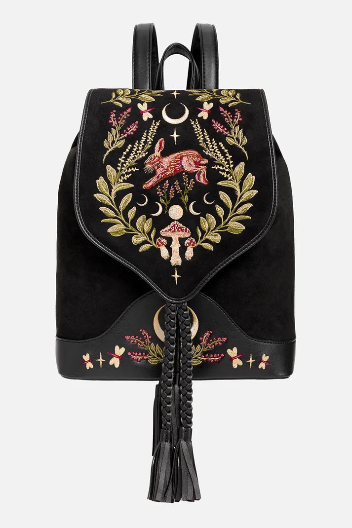 Al cuore di questo zaino c'è una lepre che balza: custode della foresta, compagna della luna. Misteriosa, simbolica e ricca di grazia selvaggia. Circondata da ricami di funghi e piante del sottobosco, le sue texture terrose aggiungono profondità e un tocco di magia.