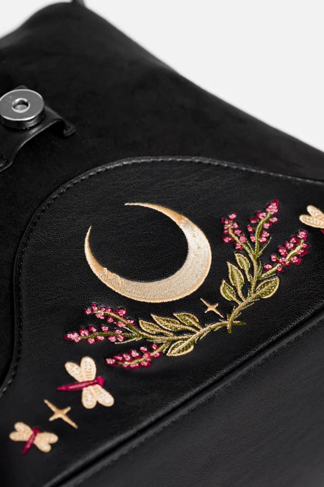 * ✦ Dettagli alla base: Ricami di luna, libellule e fiori sul fondo della borsa.