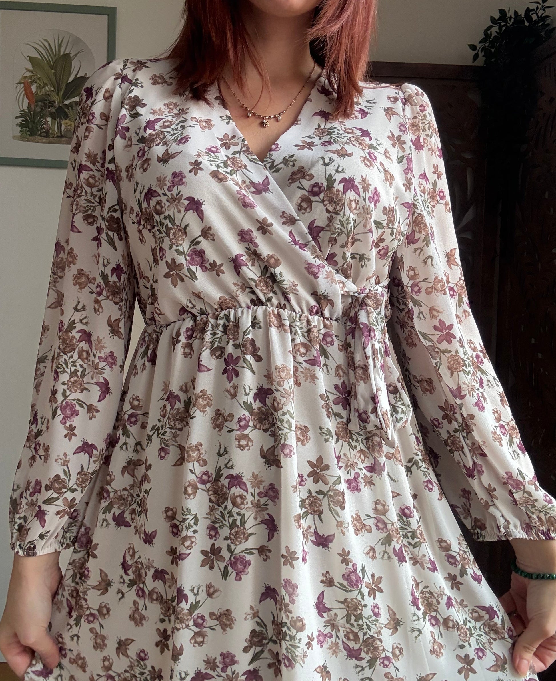 Abbraccia il tuo lato romantico con questo delizioso abito corto in stile boho chic con una vivace stampa floreale su base bianca. Scollo a portafoglio a V regolabile da un laccino laterale e sottoabito nude incorporato. Le maniche presentano un leggero effetto a sbuffo sulle spalle e sono rifinite con polsini elastici. La parte inferiore è impreziosita da un volant arricciato che aggiunge movimento e un tocco giocoso e la vita è elasticizzata. Un abito veramente versatile, si può indossare in inverno con cardigan, gilet in lana o giacche pesanti e stivali oppure nelle mezze stagioni con sandali e gilet boho.