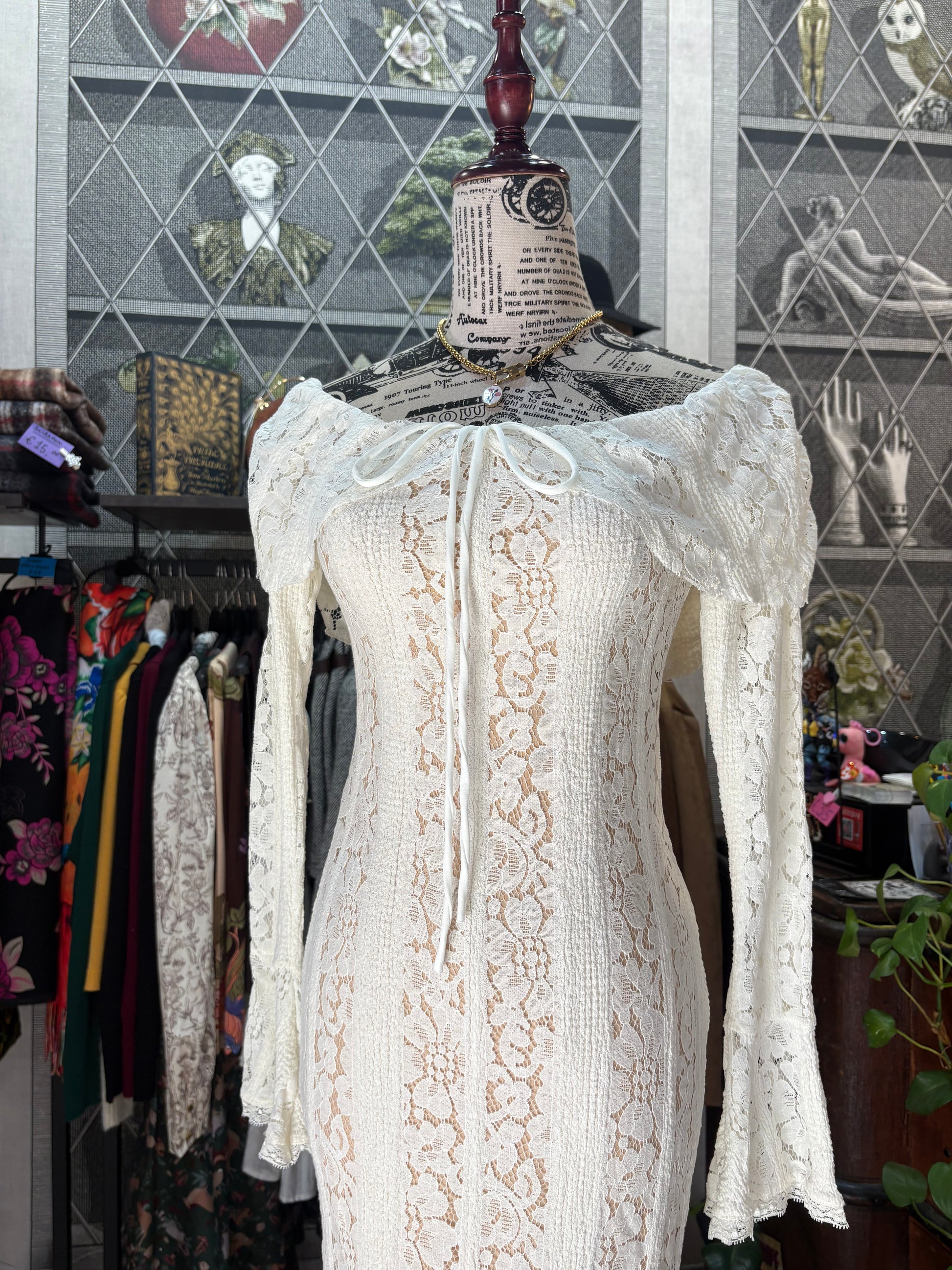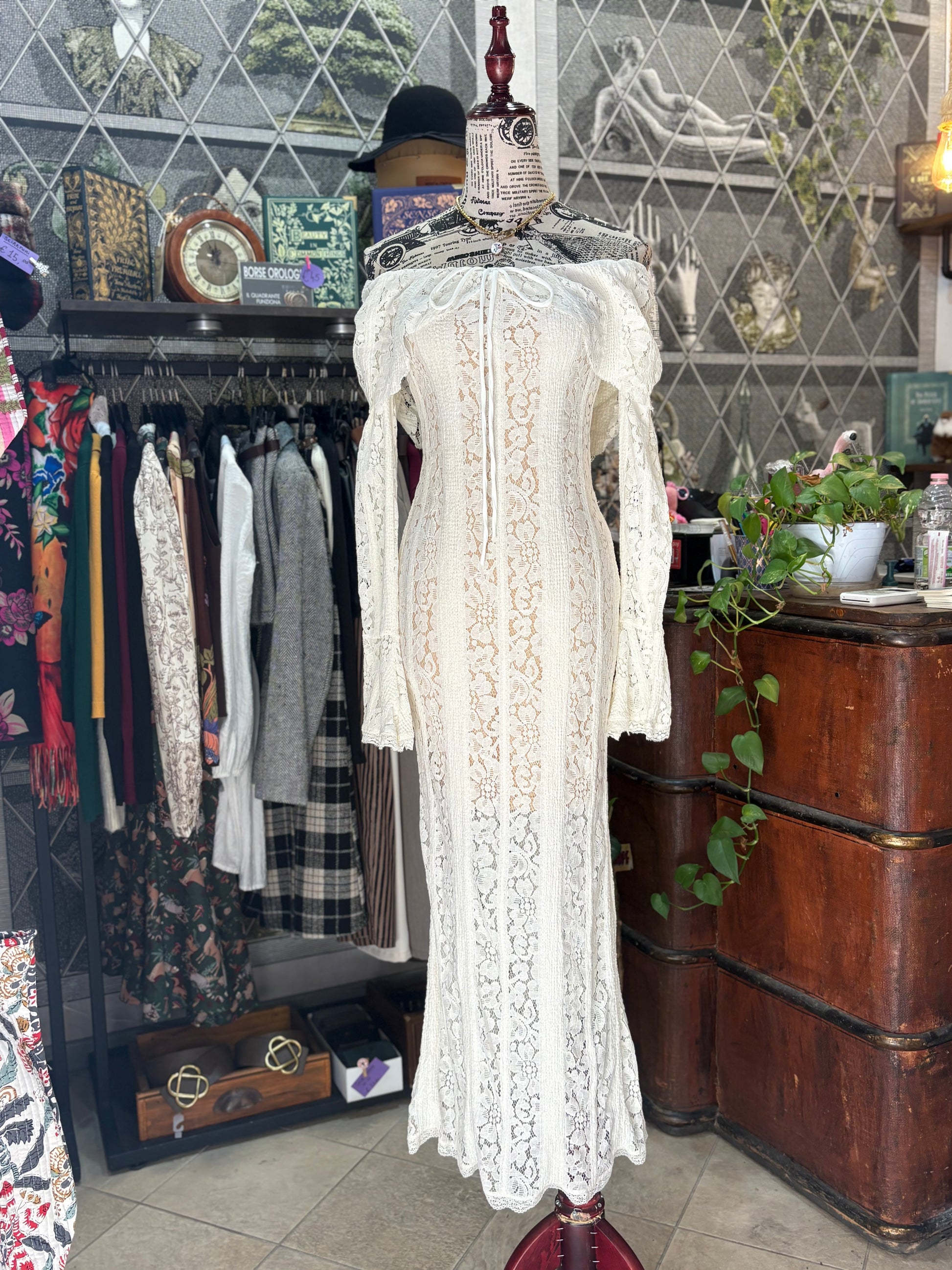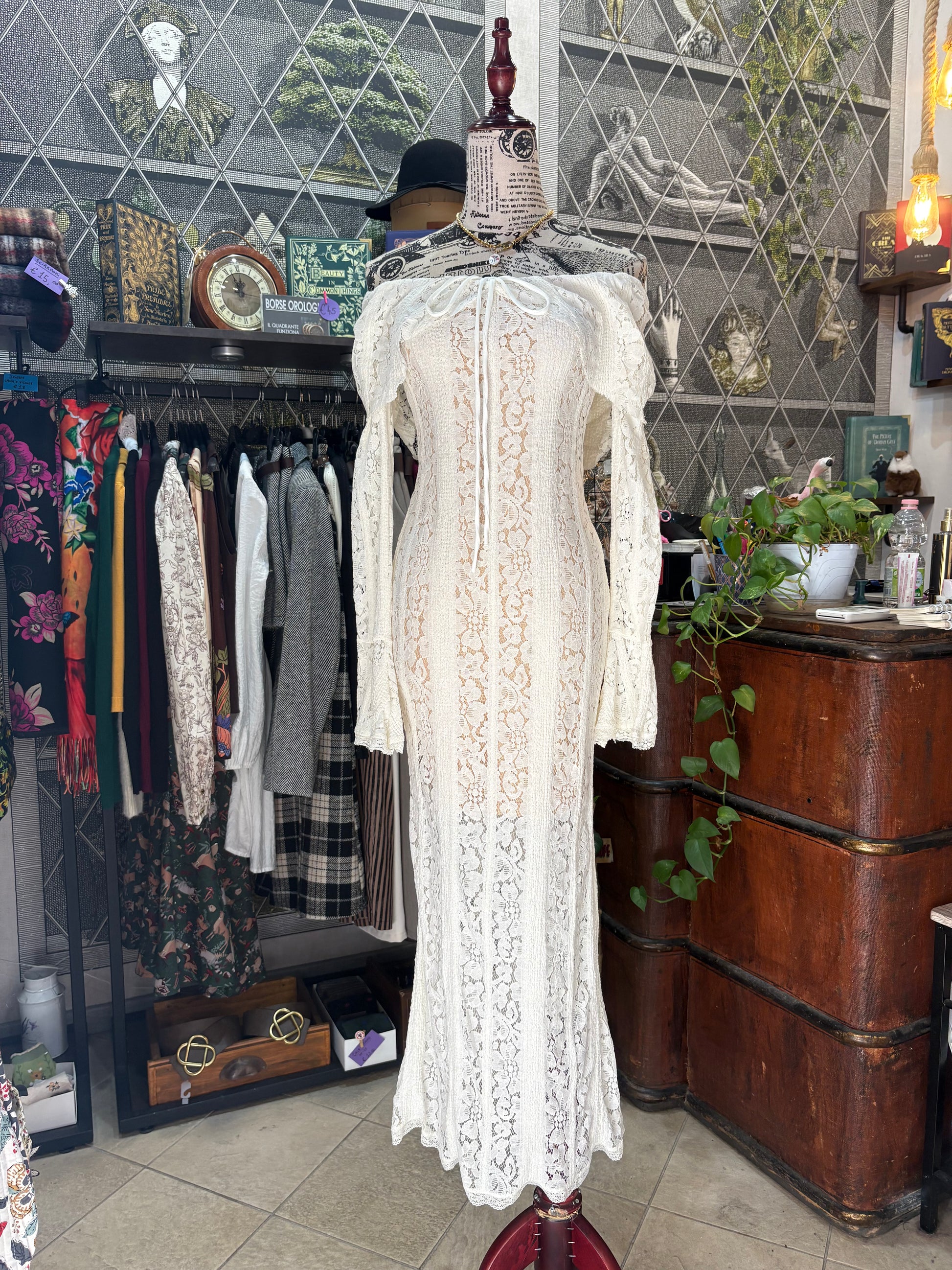Abito lungo retrò romantico in pizzo color crema
