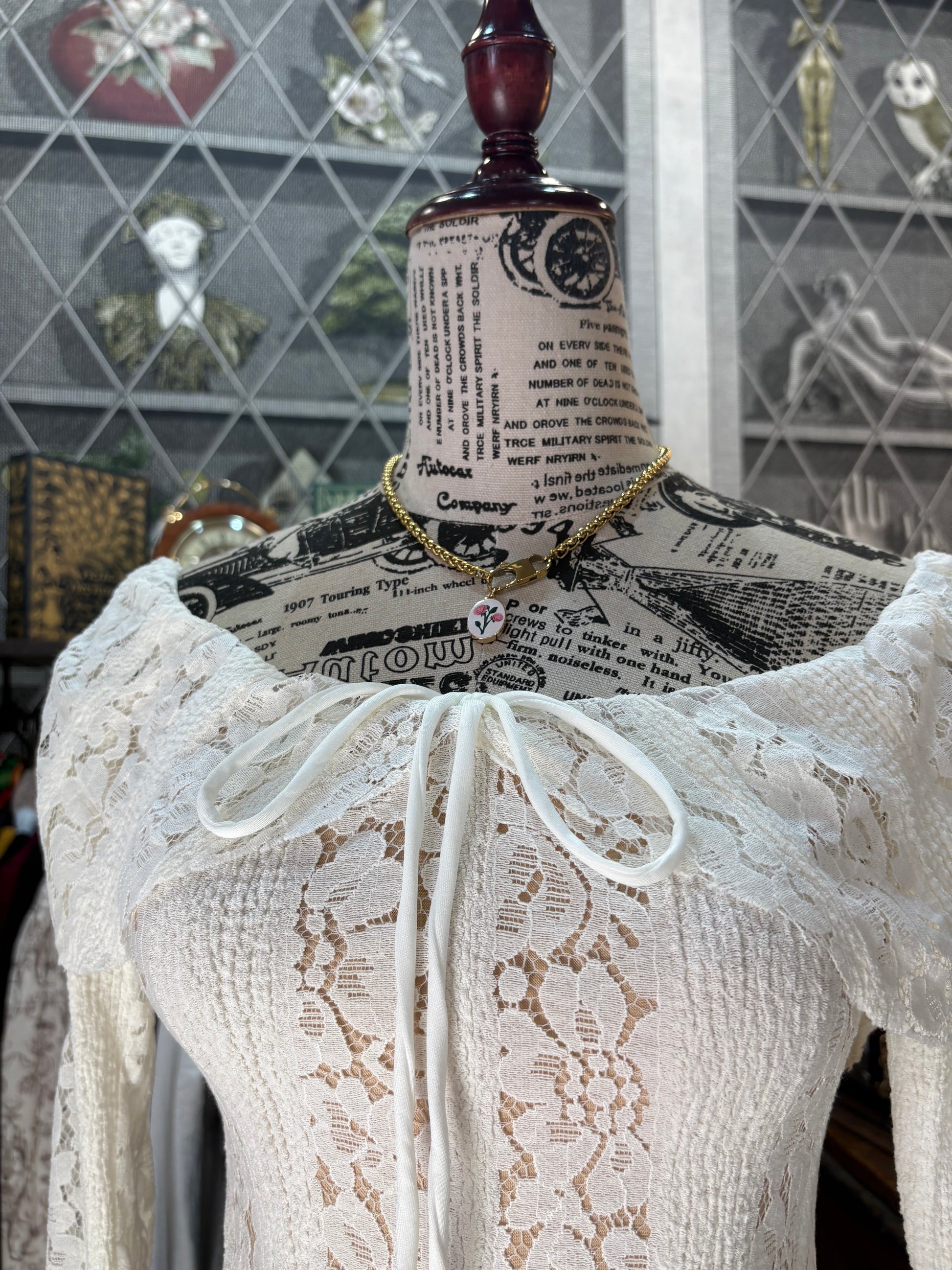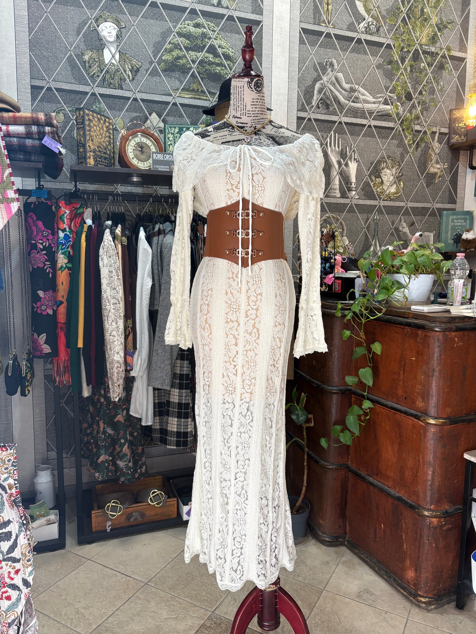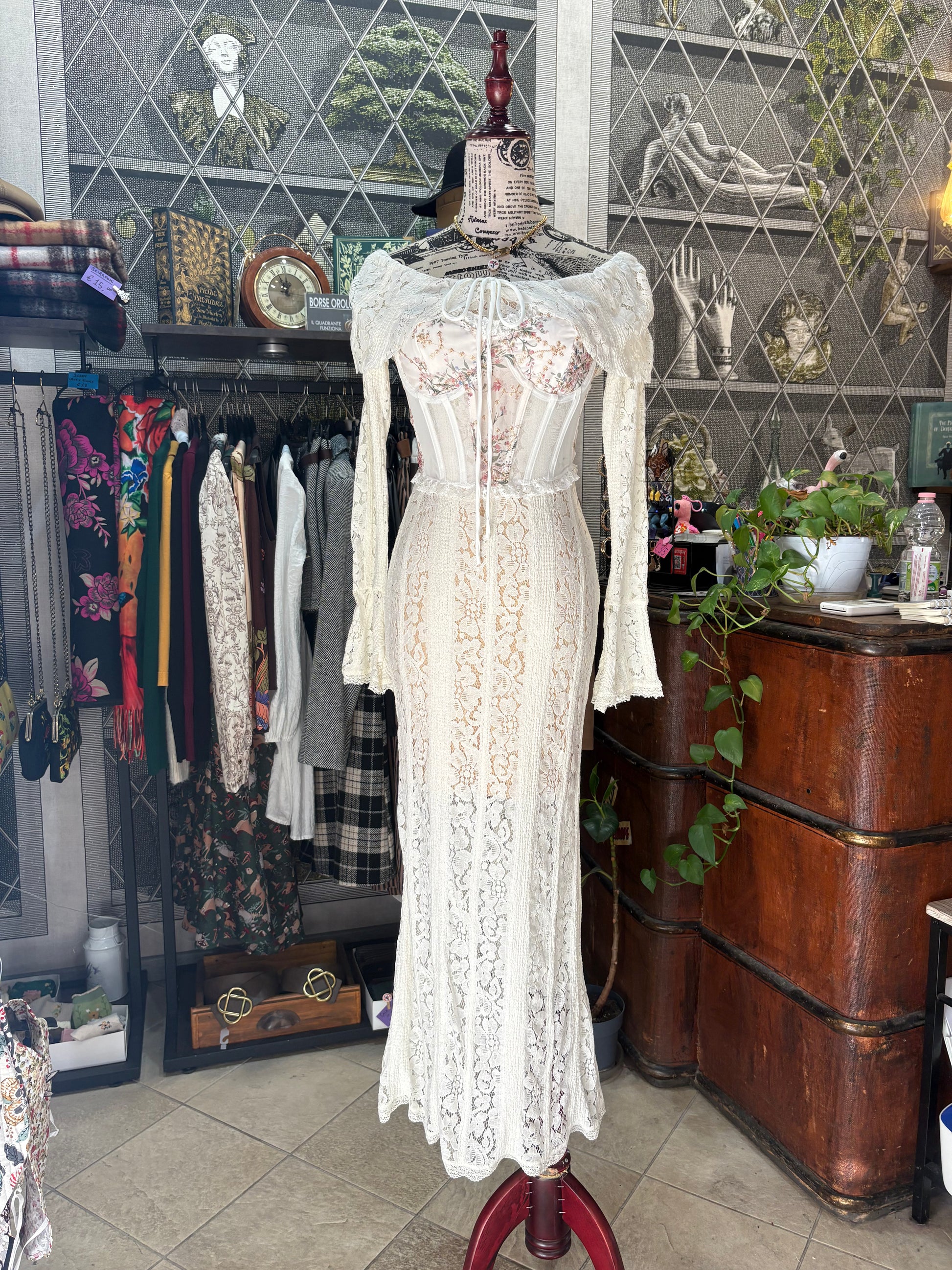 Abito lungo retrò romantico in pizzo color crema