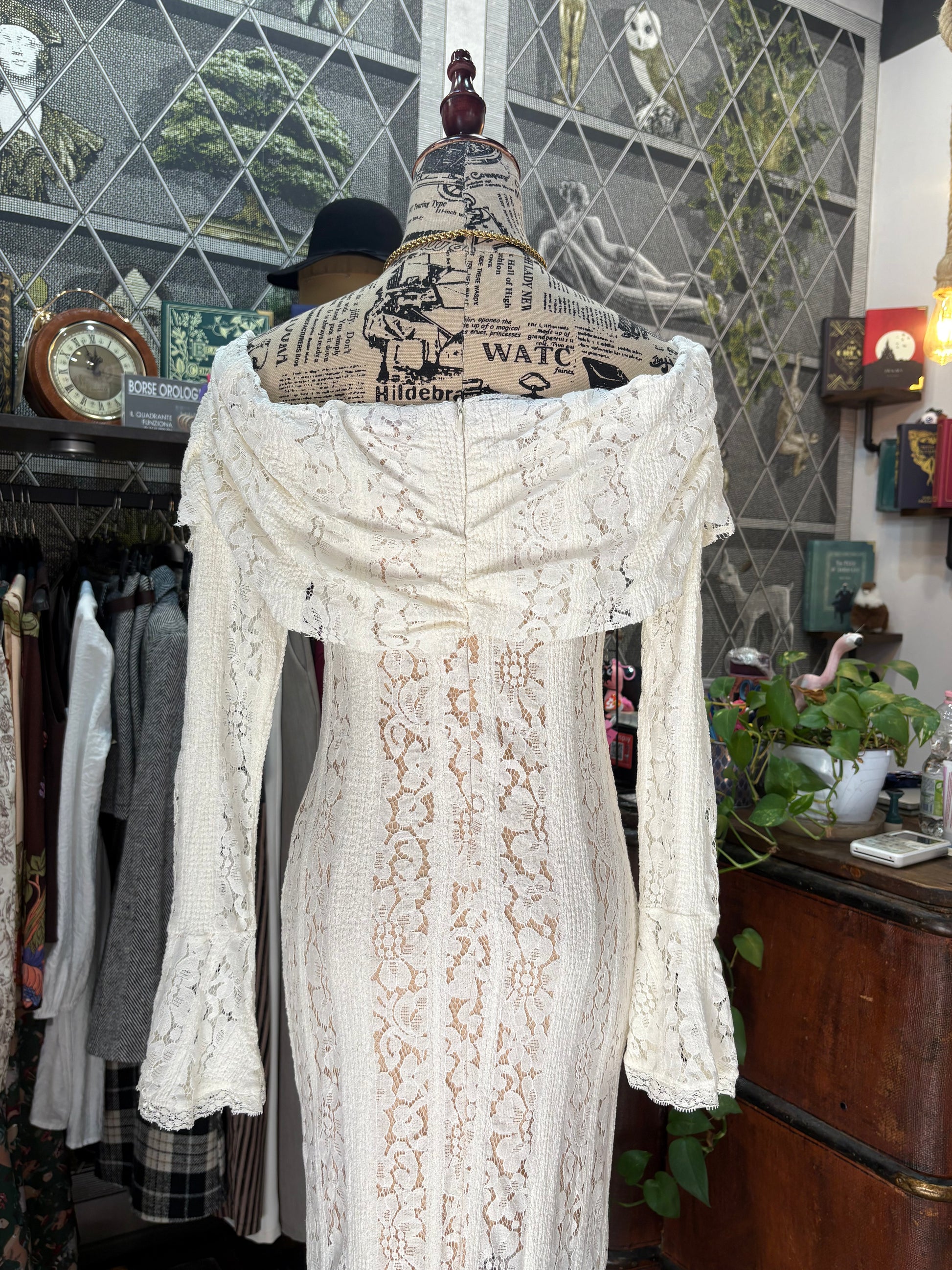 Abito lungo a sirena in stile vintage,in pizzo, con scollo a barca arricciato e volant, manica svasata e fiocco sullo scollo. Ha un sottoabito color rosa cipria corto cucito sotto.