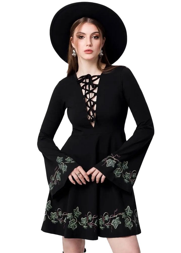 Abito Mini Tangled Vines– Abito Botanical Witch con stampa di Edera e maniche a campana