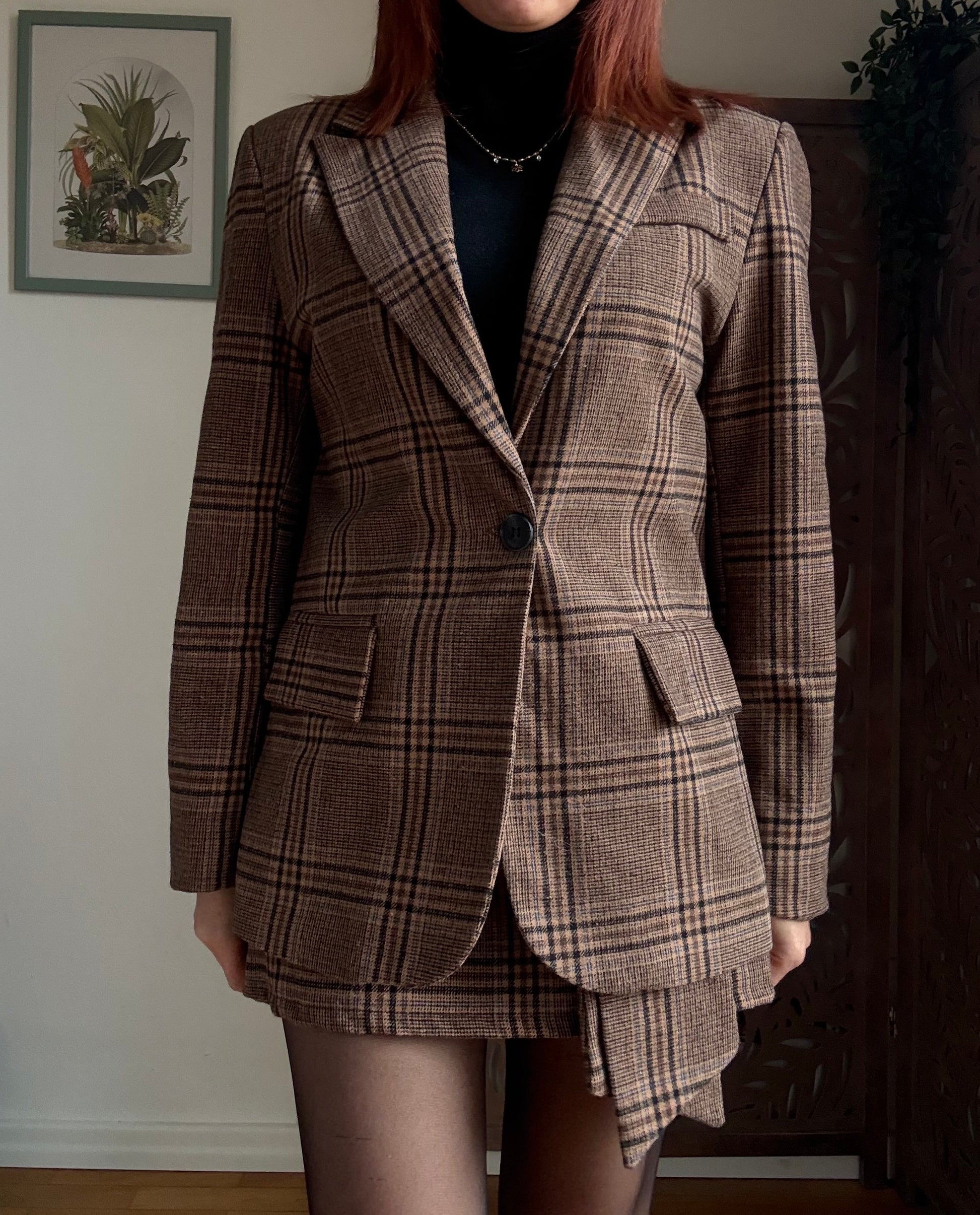 Blazer strutturato a quadri con chiusura a un bottone - Eleganza Preppy Chic. Caratterizzato da una raffinata fantasia a quadri nei toni del marrone tabacco, nero e beige, tipica della moda autunnale e invernale. Chiusura frontale monopetto con bottone singolo scuro a contrasto. Tasche decorative con pattina sui fianchi e fodera interna nera. Abbinalo alla sua minigonna/skort coordinata per un tailleur d'impatto.