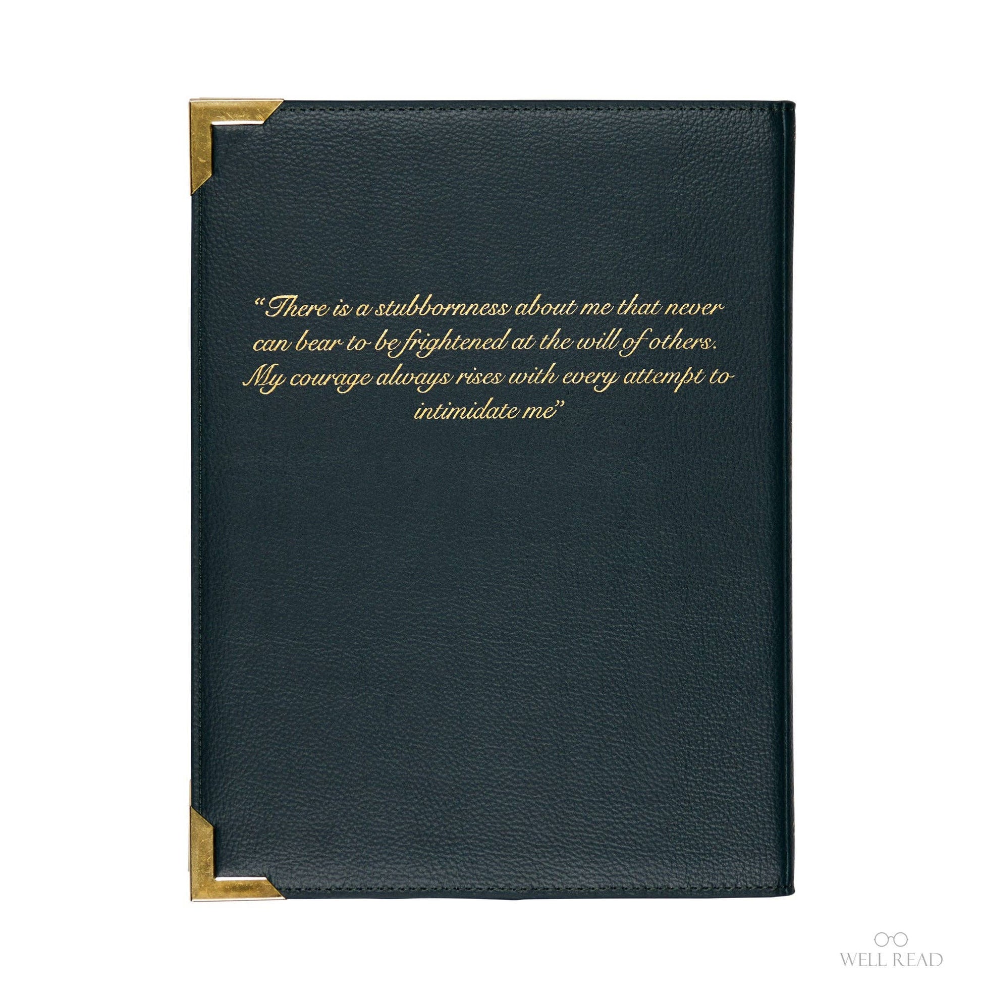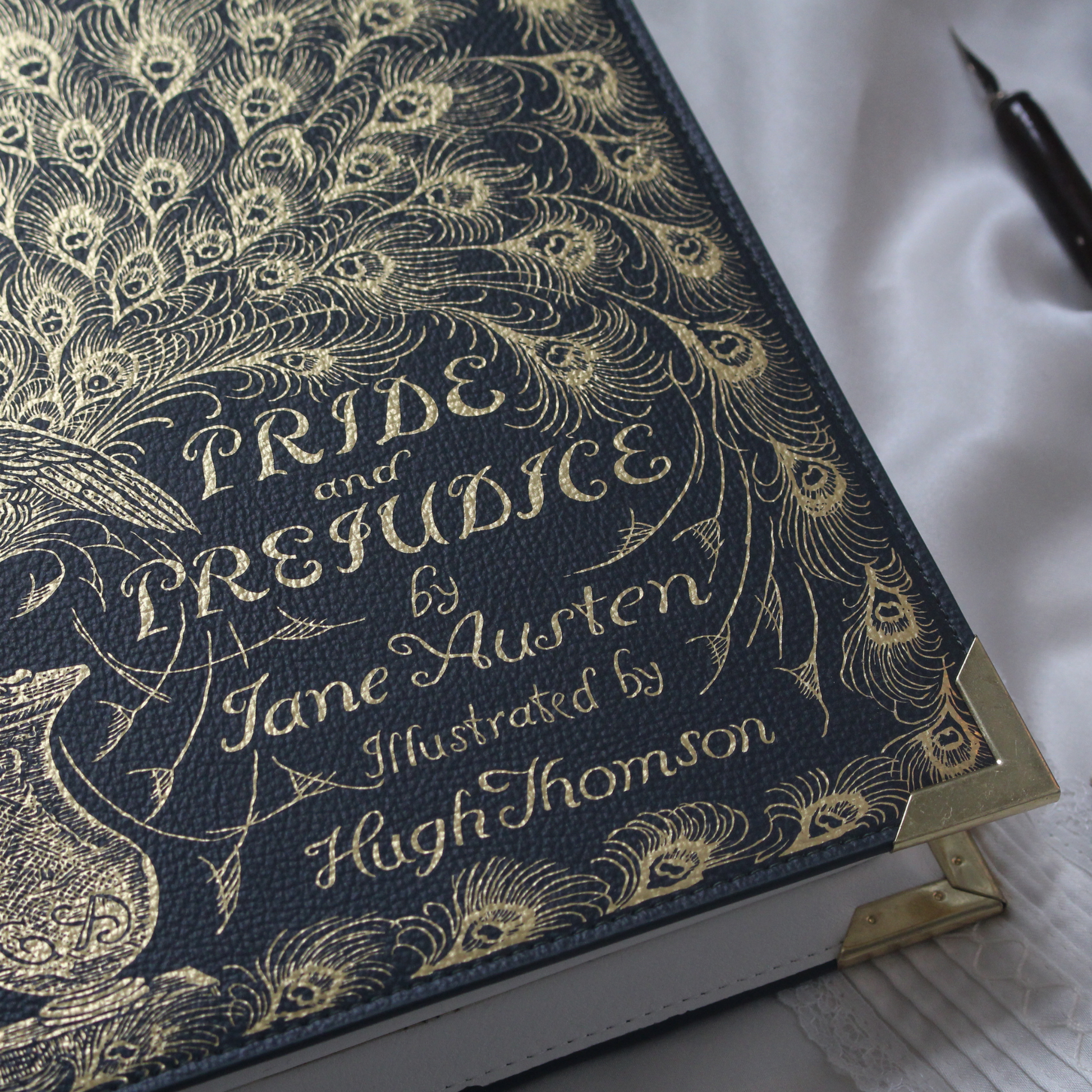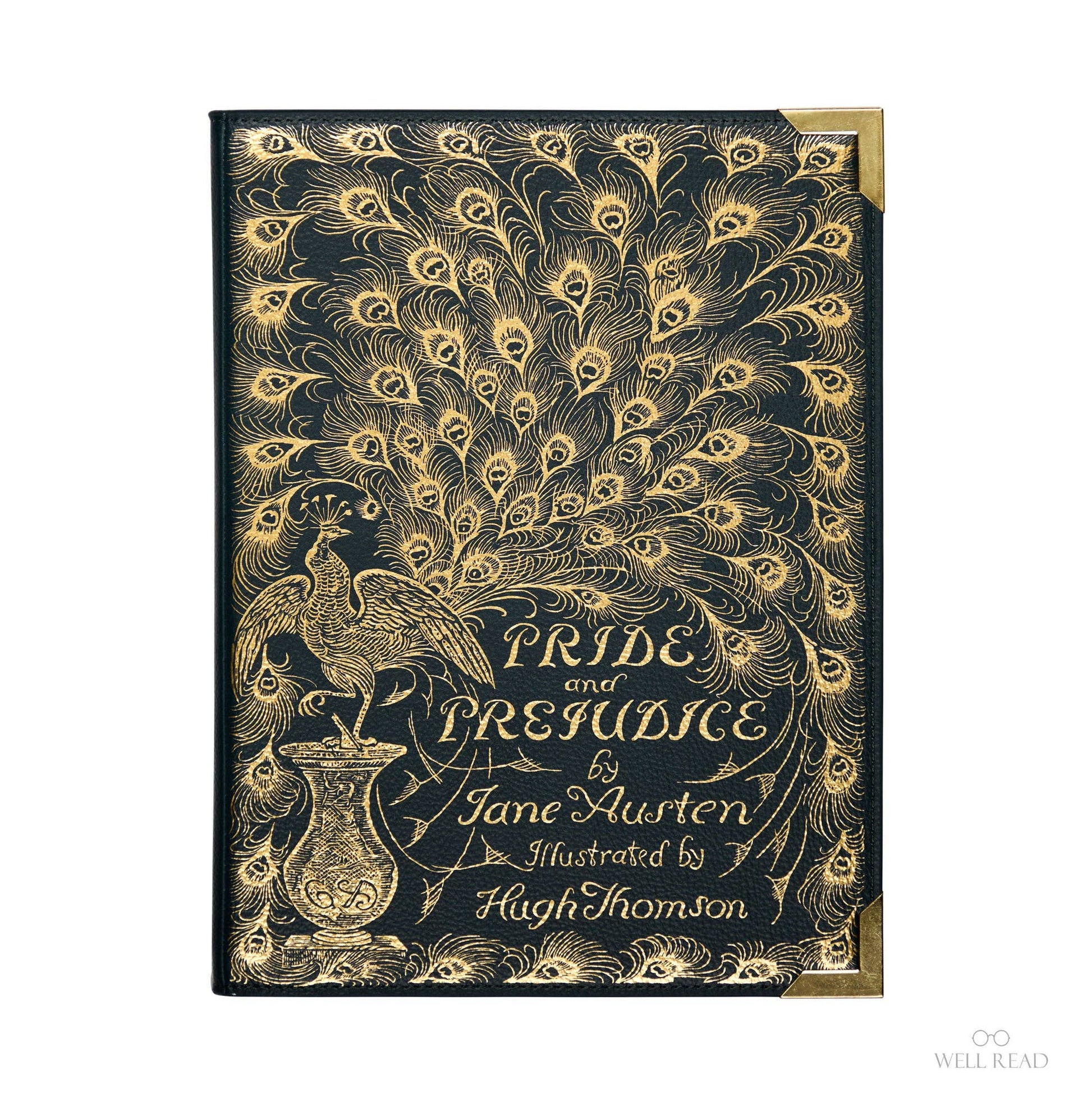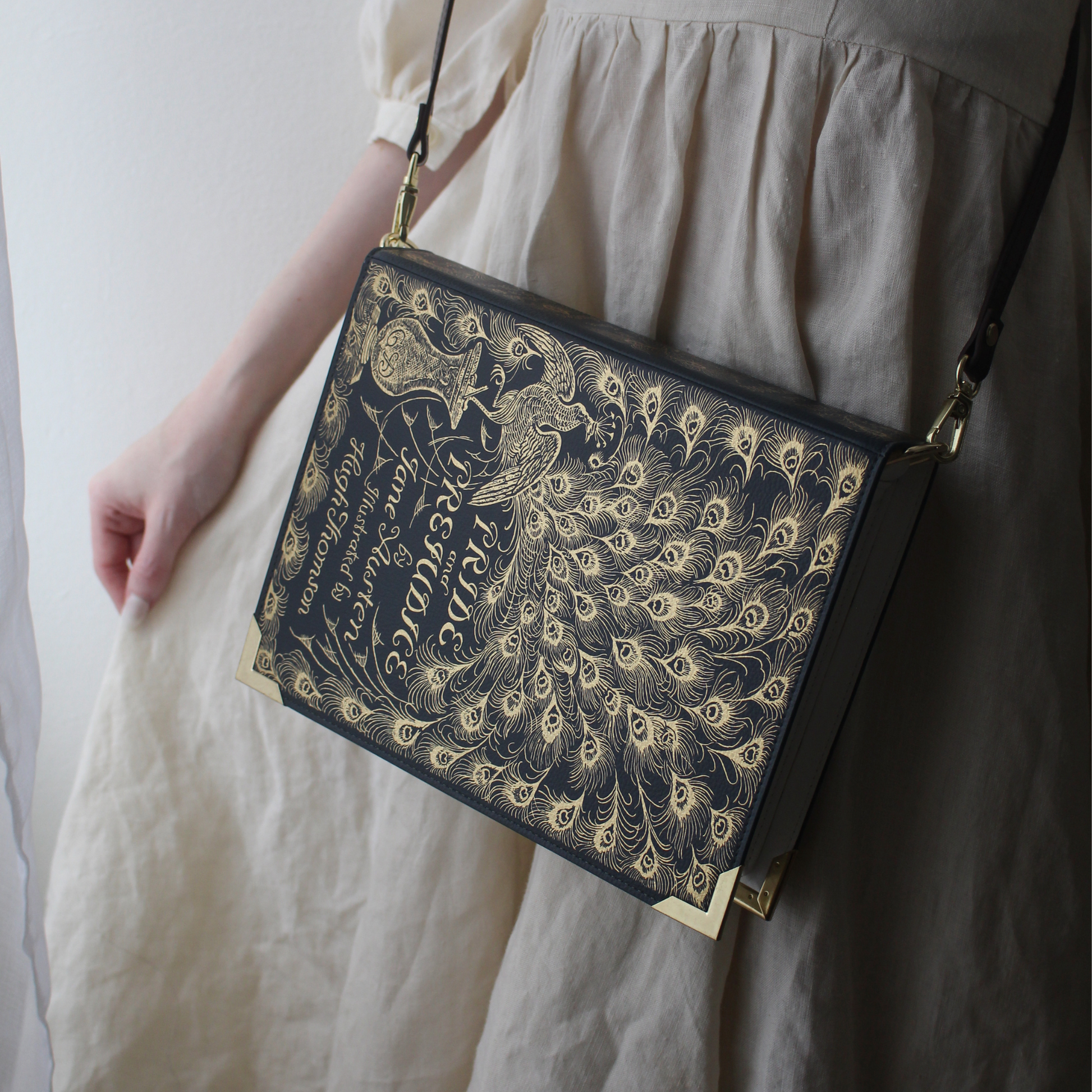 Entra nel mondo incantevole di Jane Austen con la nostra straordinaria borsa in pelle vegana di Orgoglio e Pregiudizio con dettagli in oro, una versione premium elevata del nostro design classico stampato. Ispirata al celebre romanzo del 1813, questa edizione lussuosa presenta la stessa copertina originale di Hugh Thomson ma con squisiti dettagli in oro che brillano elegantemente alla luce. La borsa presenta un design fantasioso di piume di pavone dorate su uno sfondo verde intenso, catturando perfettamente l'essenza del capolavoro di Austen. Sul retro è riportata la potente citazione: "C'è una testardaggine in me che non può mai sopportare di essere spaventata dalla volontà degli altri. Il mio coraggio cresce sempre con ogni tentativo di intimidirmi." Che tu ti stia vestendo per un'occasione formale o semplicemente affrontando la tua routine quotidiana, questa borsa premium aggiungerà sicuramente un tocco unico e sofisticato al tuo abbigliamento, perfetta per coloro il cui cuore appartiene al mondo della letteratura.