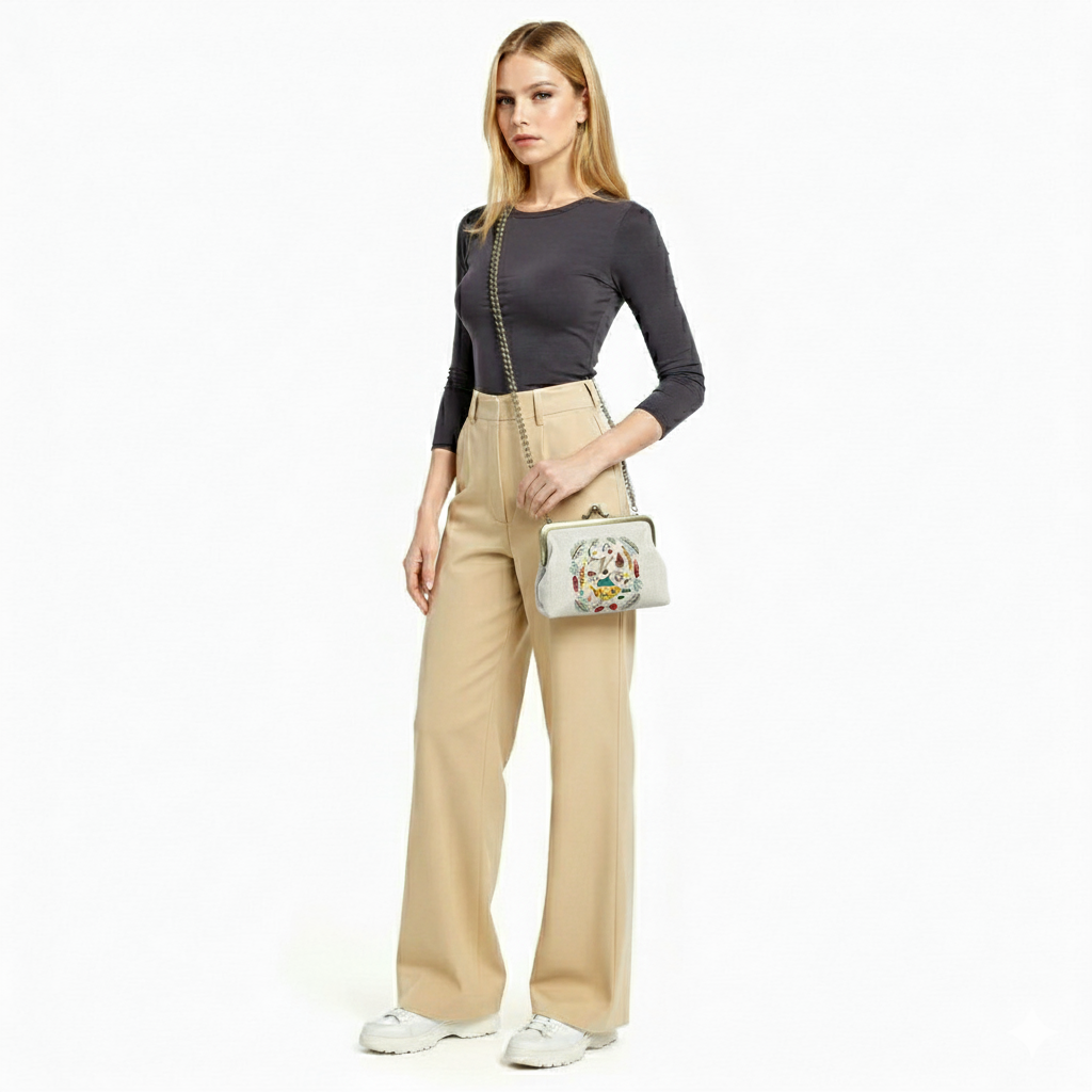 Questa borsa è perfetta per chi adora essere originale. Il dettaglio grafico è interamente ricamato sulla borsa. Dettagli in metallo per un look vintage, chiusura a scatto e Interno foderato in tessuto a pois. Tasca interna con cerniera Può essere utilizzata come borsa a mano o a tracolla. Include una tracolla staccabile in finta pelle da 30 cm e una tracolla a catena staccabile da 135 cm. Materiale di alta qualità in misto cotone e lino. Misure approssimative Lunghezza: 17 cm Larghezza: 24 cm Altezza: 4 cm