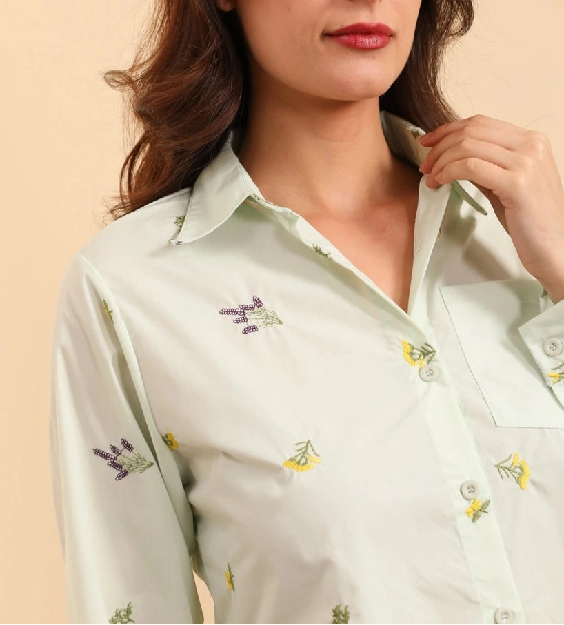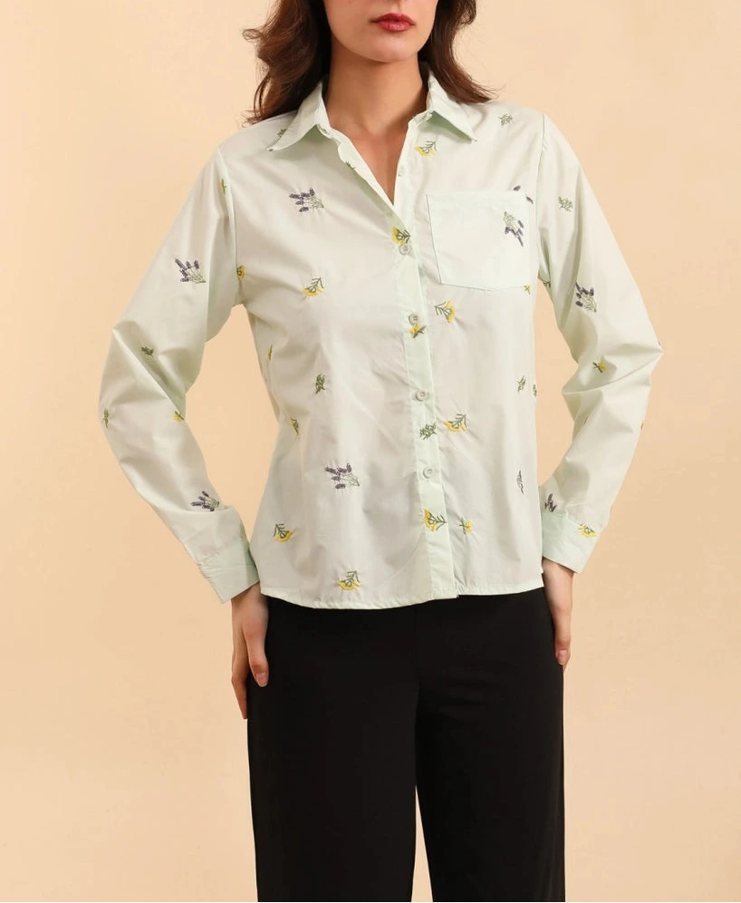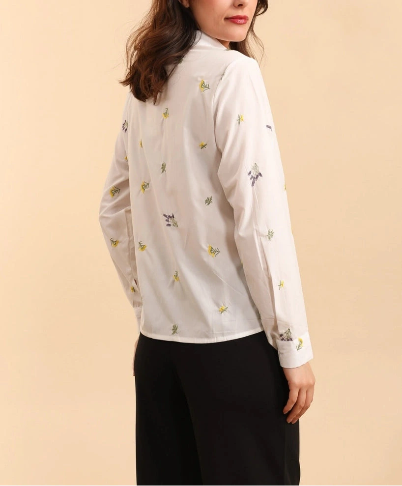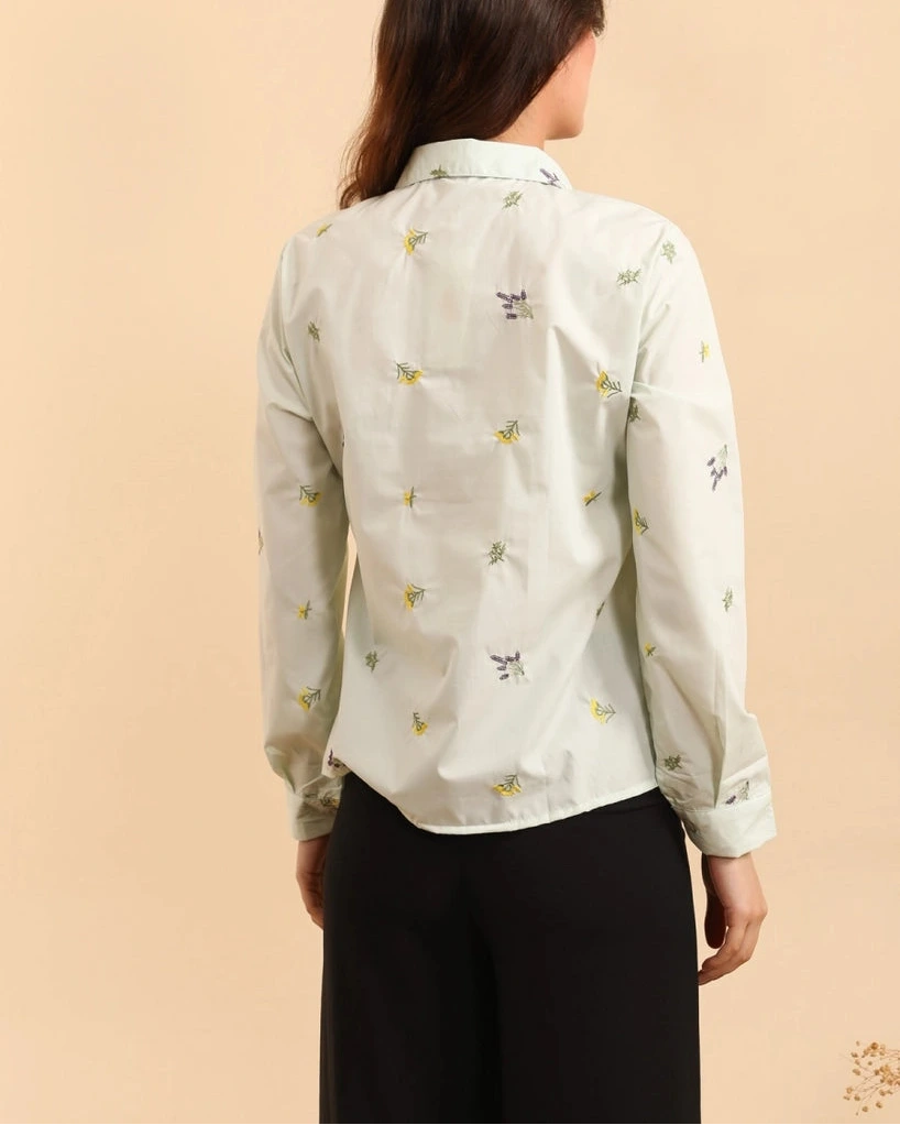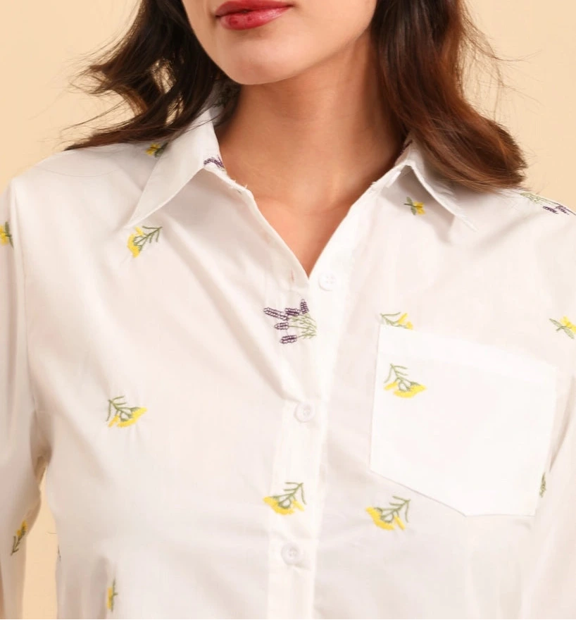 Camicia classica in cotone popeline con un tocco di romanticismo bucolico, ravvivata da delicati ricami.