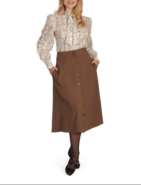 Camicetta Retrò in stile anni '40 con fiocco a cravattino che può essere annodato in vari modi o lasciato sciolto per un look più disinvolto e stampa conversational con lepri e decorazioni florerali color seppia su sfondo bianco sporco, caratterizzata da bottoni gioiello dorati, arricciature sulla spalla e sui polsini.