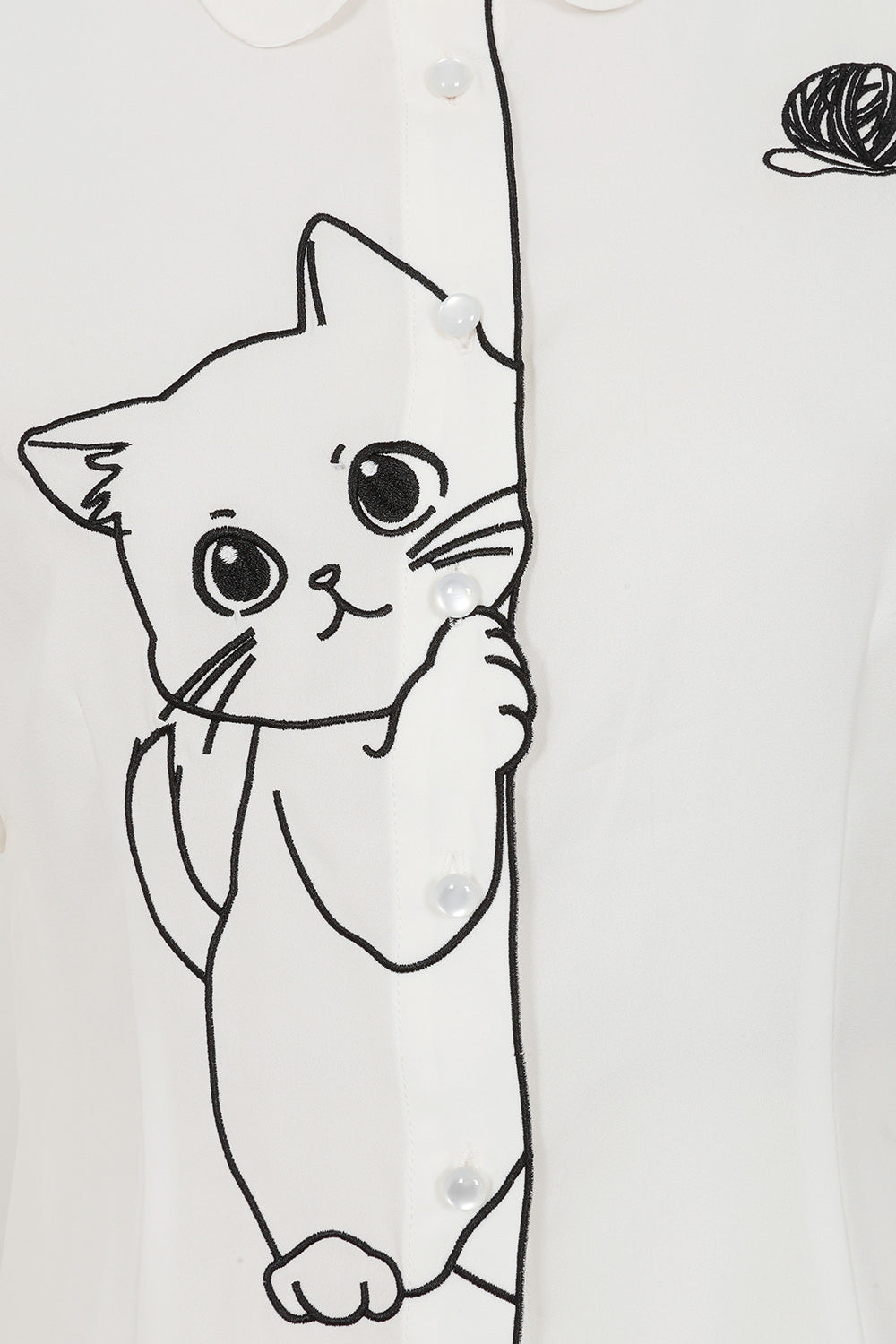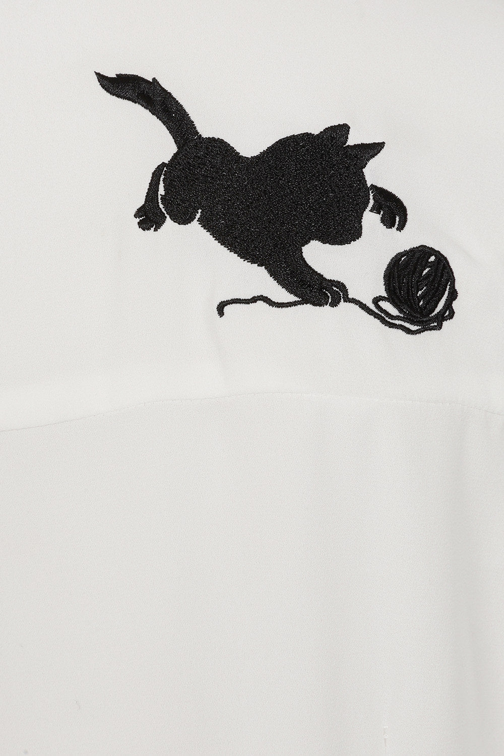 Il vero protagonista è l’adorabile gatto nero ricamato che fa capolino con curiosità dal bordo della bottoniera anteriore, mentre osserva un piccolo gomitolo di lana sul lato opposto. Ma la sorpresa continua sul retro: un secondo ricamo mostra il gattino in pieno gioco mentre rincorre lo stesso gomitolo sulla spalla destra.