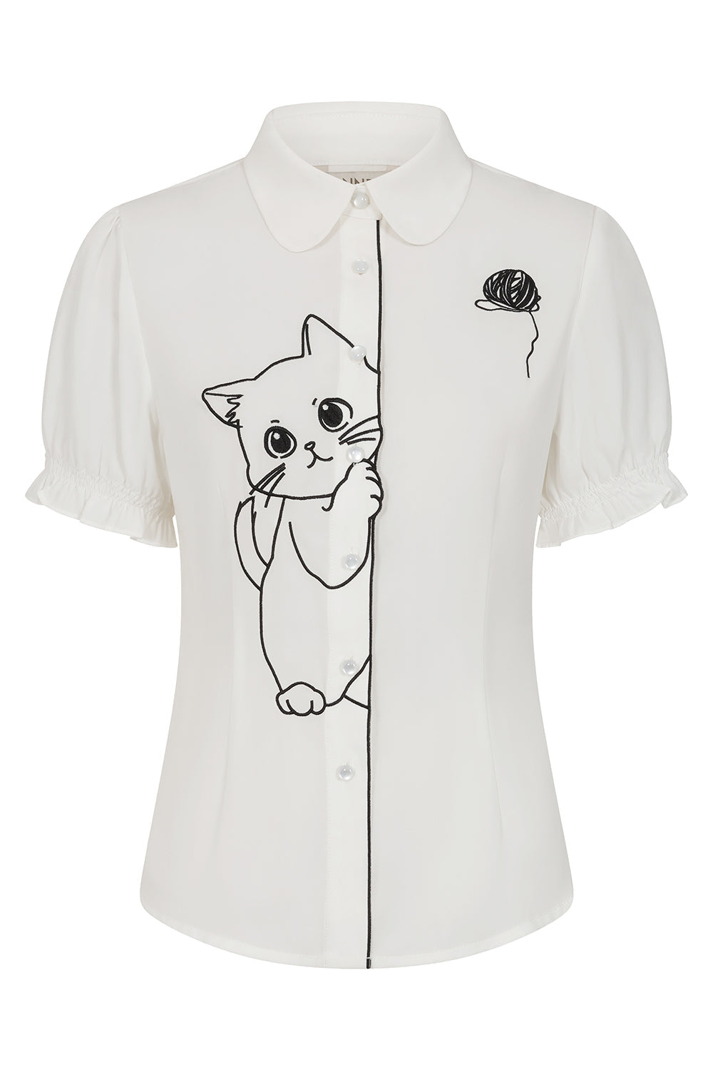 Aggiungi un tocco di giocosa eleganza al tuo guardaroba con questa camicetta inglese Sophie Kitty Cat. Caratterizzata da un design d'ispirazione vintage degli anni '50, questa camicia bianca è il mix perfetto tra femminilità classica e un pizzico di ironia.