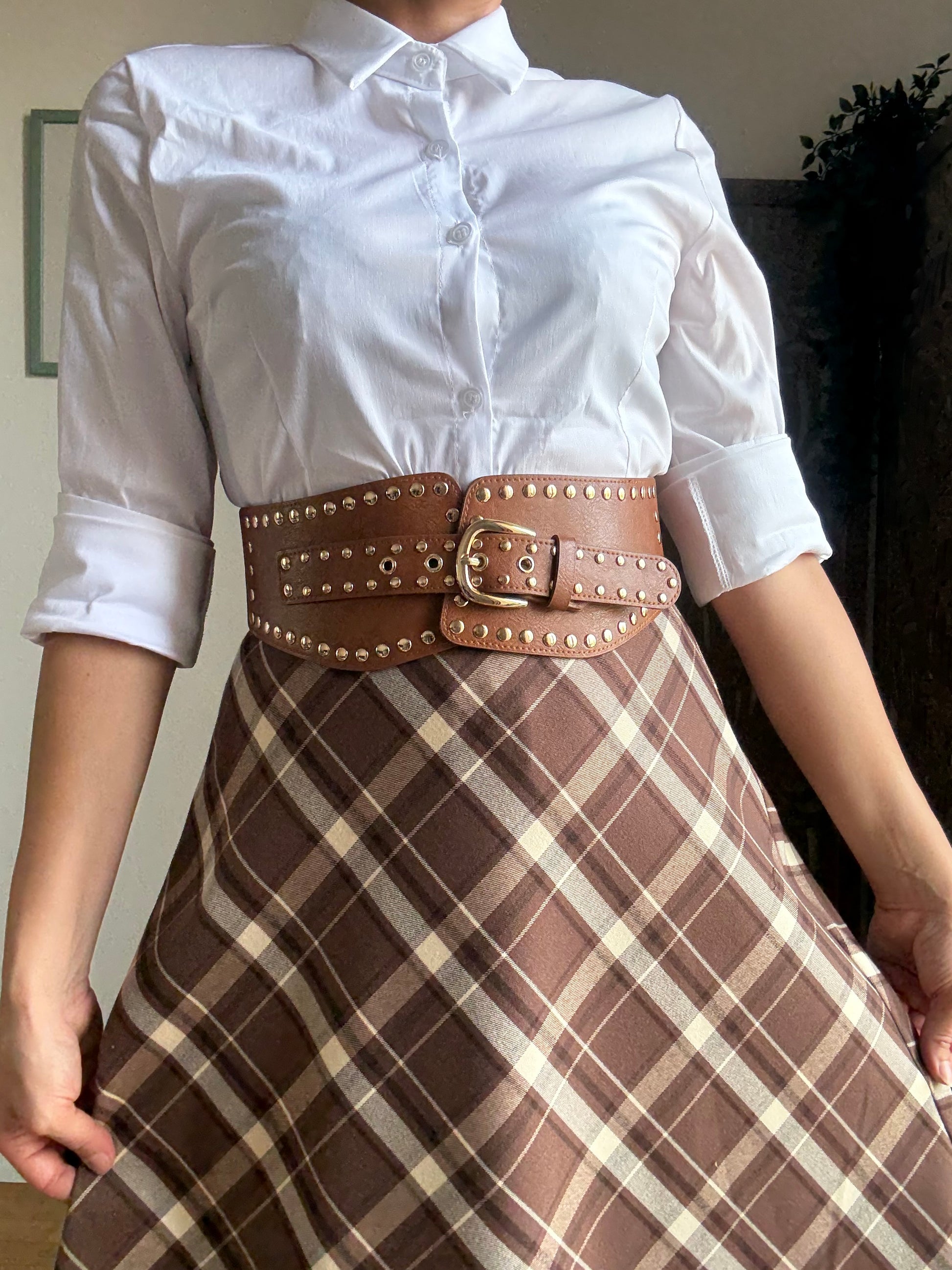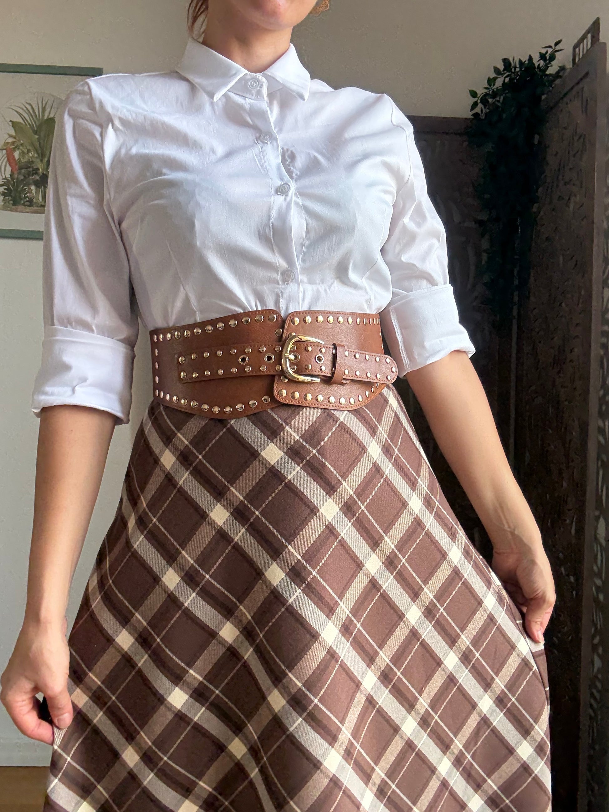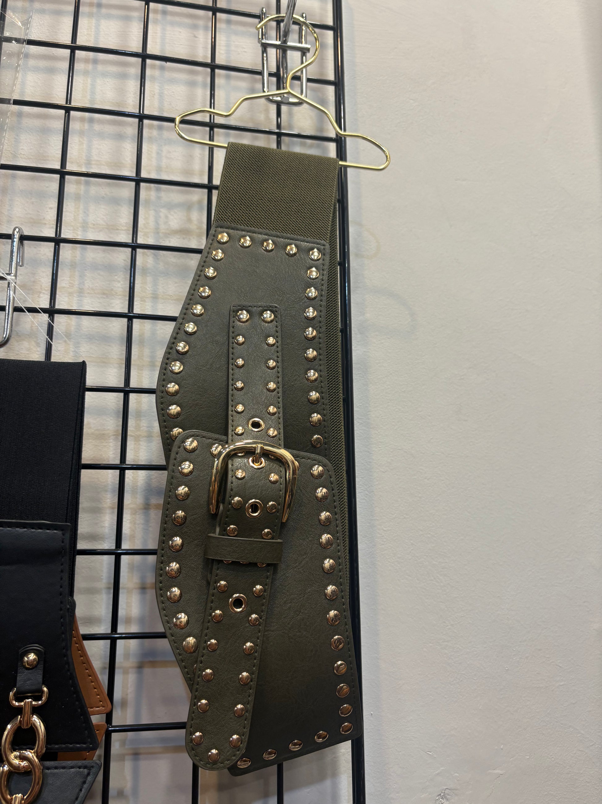 Cinturone alto elasticizzato sul retro con borchiette e fibbia frontale regolabile.