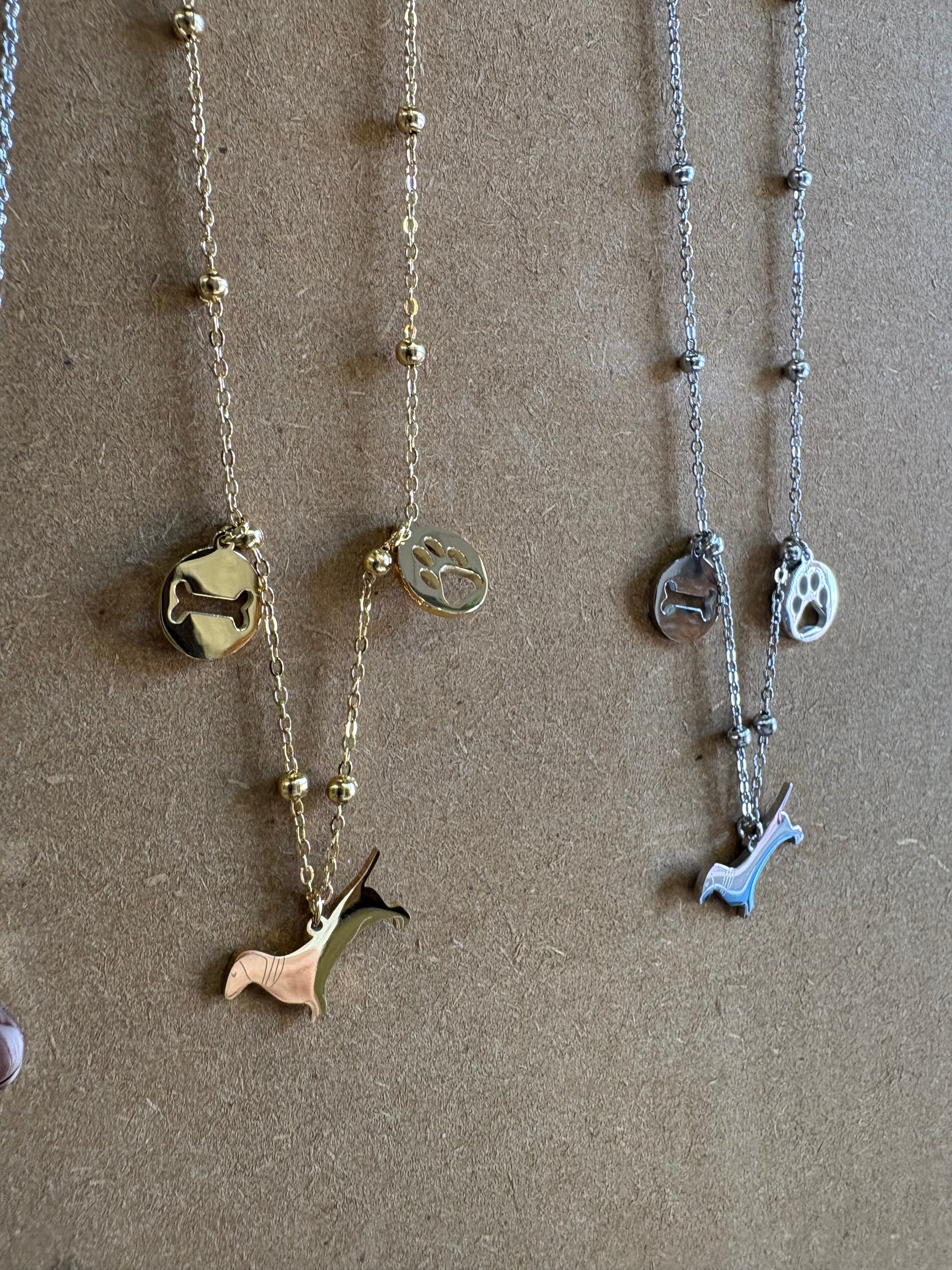 Collana bassotto in acciaio inossidabile (non perde il colore) in oro o argento con charms osso e impronta zampa. Lunghezza della catenina incluso il ciondolo: 47 cm