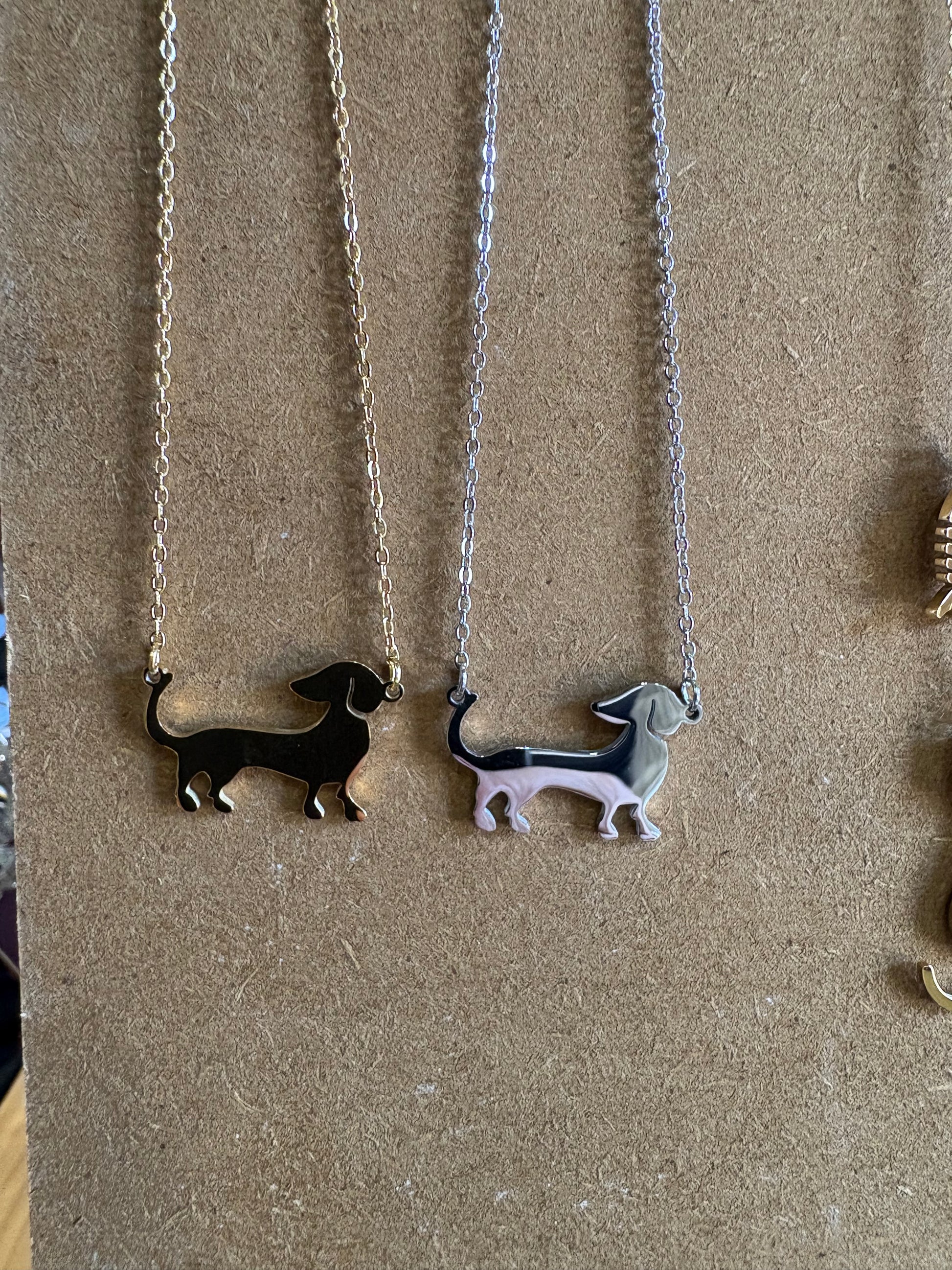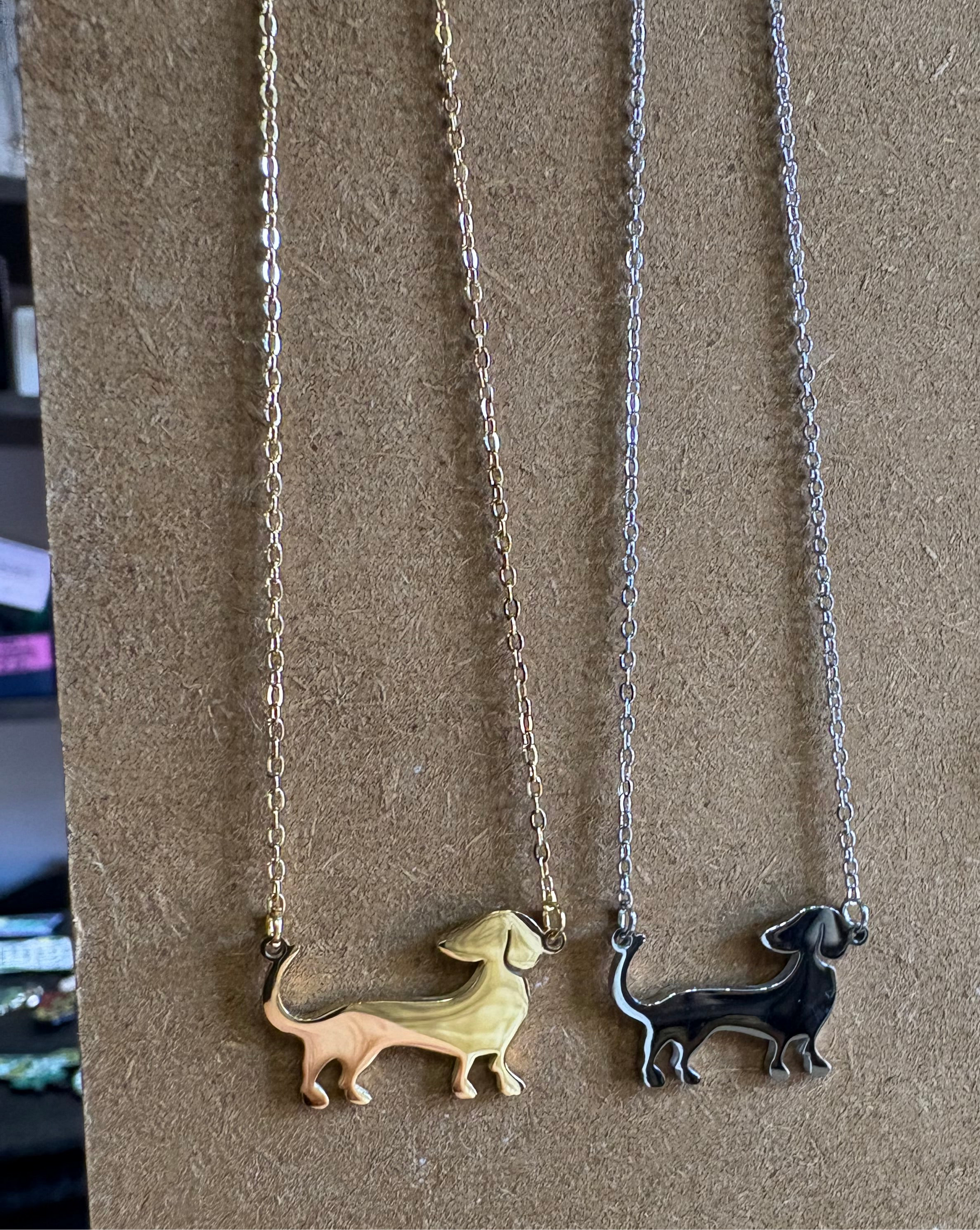 Collana bassotto in acciaio inossidabile (non perde il colore) in oro o argento. Lunghezza della catenina incluso il ciondolo: 47 cm