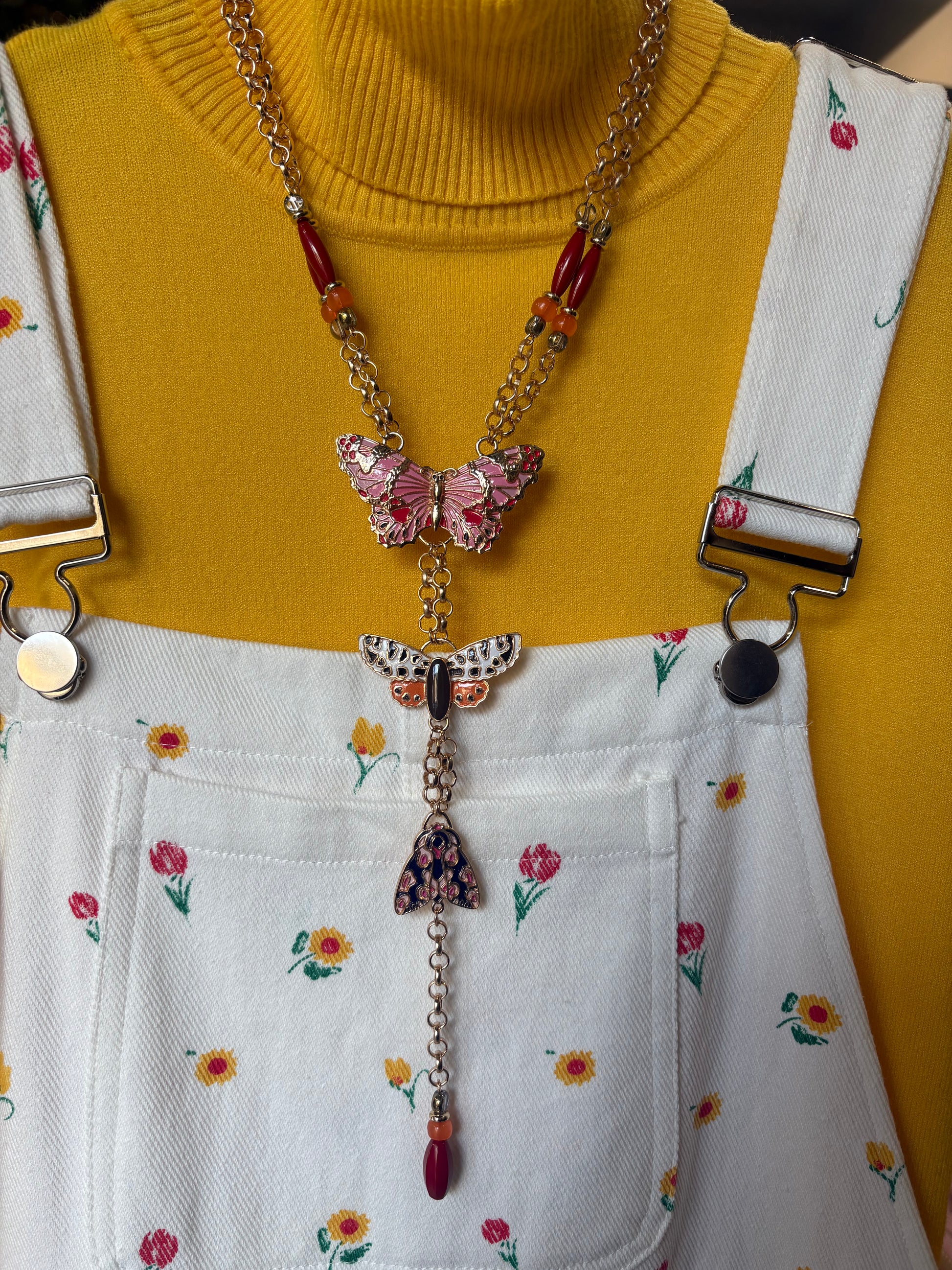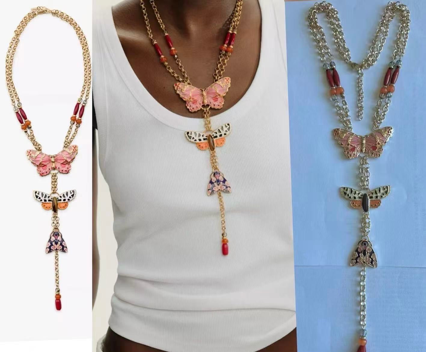 Collana lunga in acciaio inossidabile color oro con charms farfalla smaltati e pietre colorate.