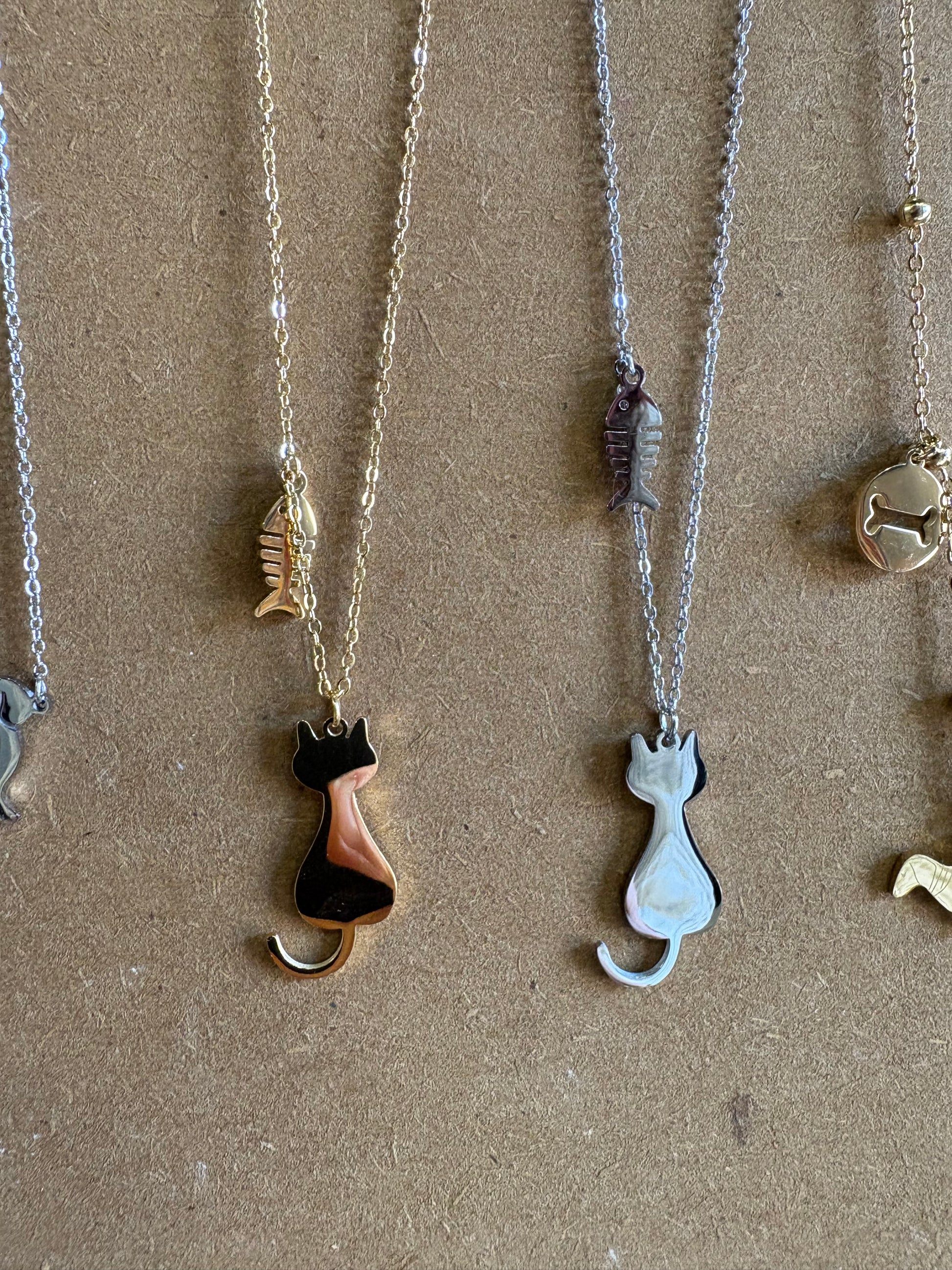 Collana gattino con charm lisca di pesce in acciaio inossidabile (non perde il colore) in oro o argento. Lunghezza della catenina incluso il ciondolo: 47 cm