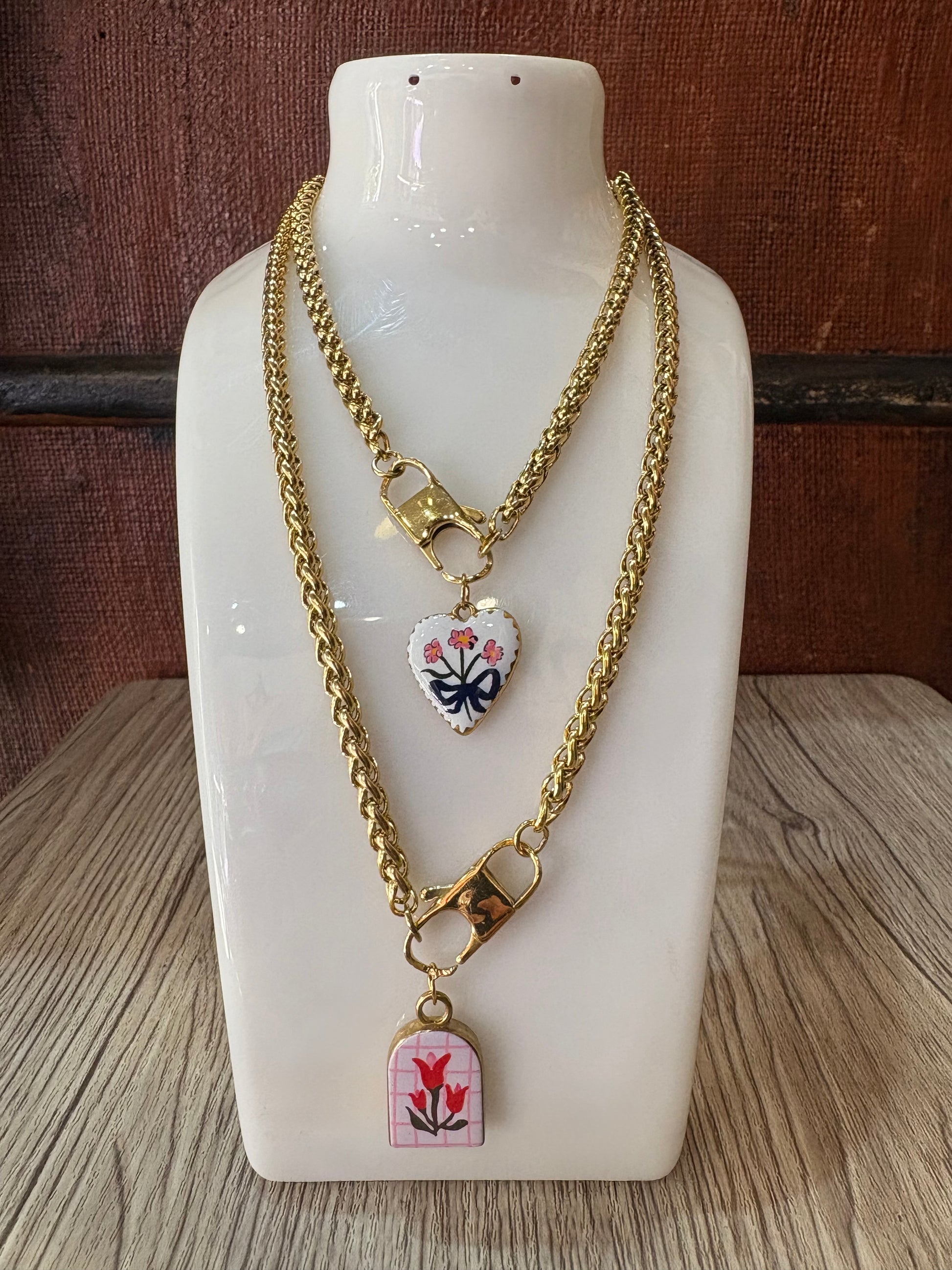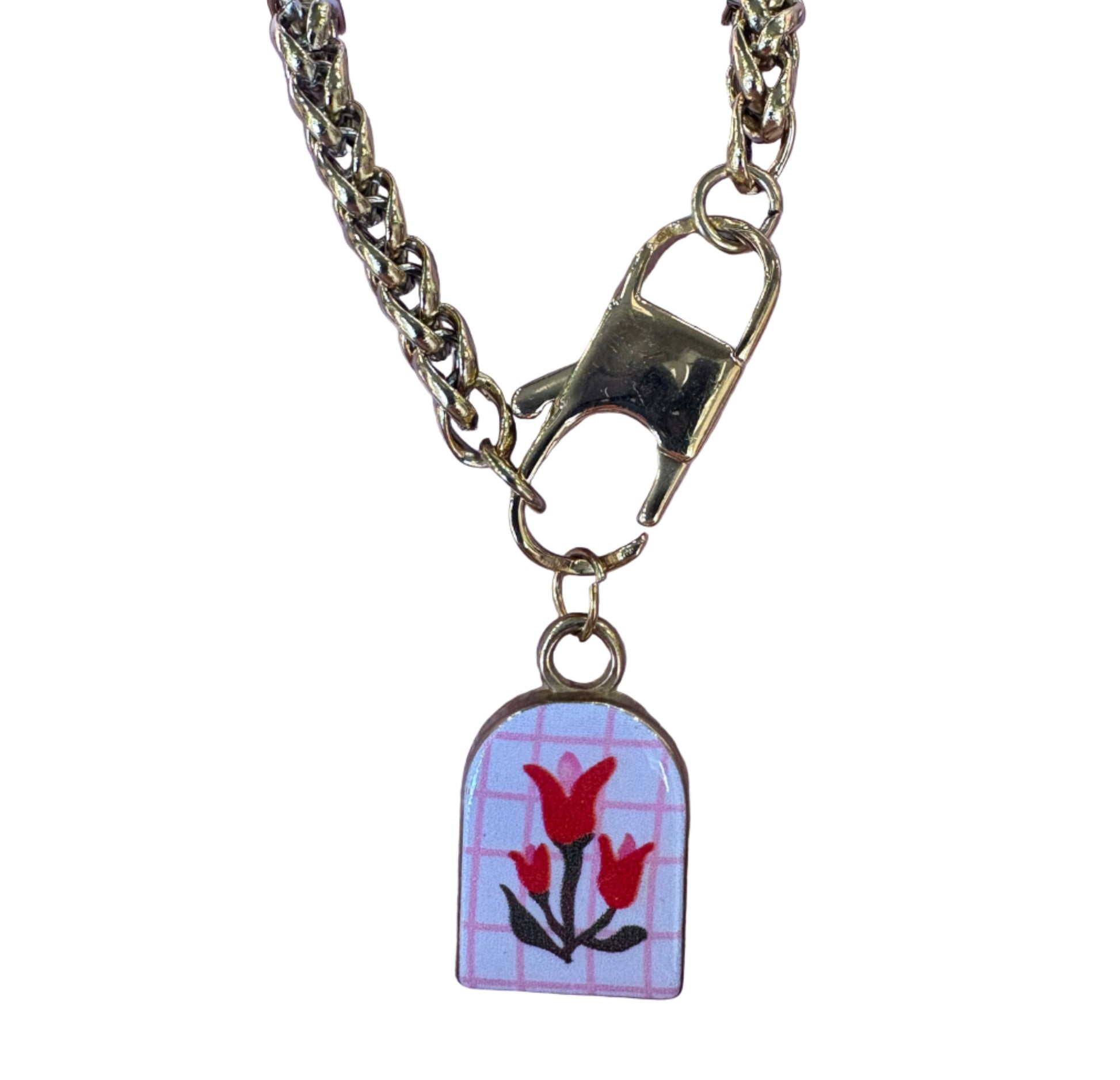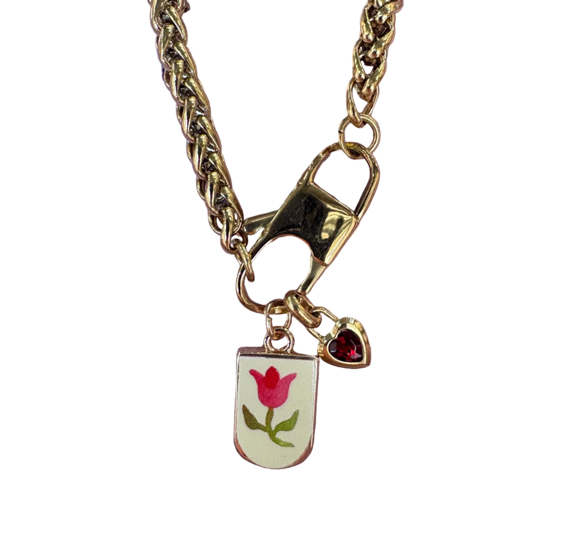 Collana a catena in acciaio inossidabile color oro con chiusura a moschettone e ciondolo smaltato con fiori
