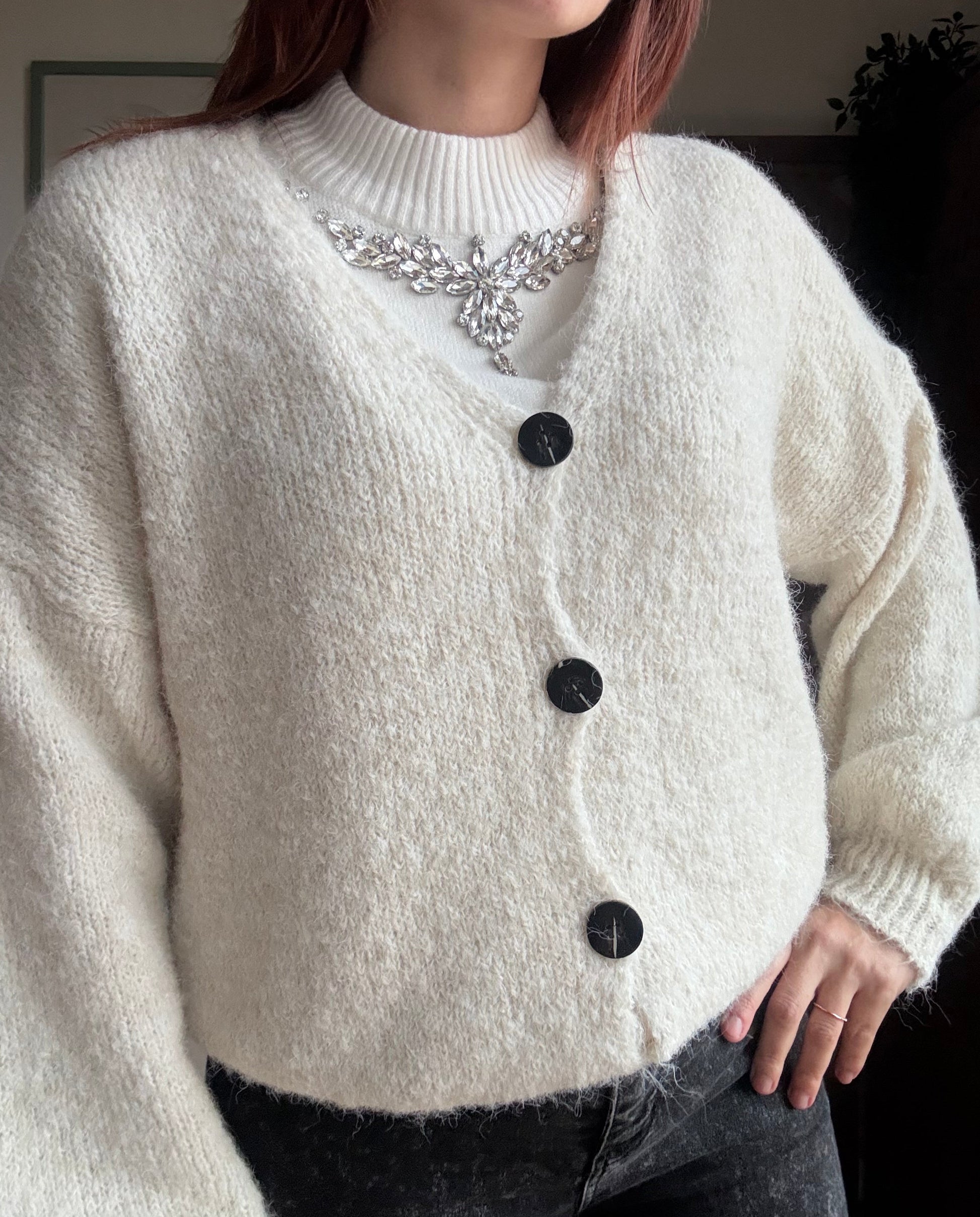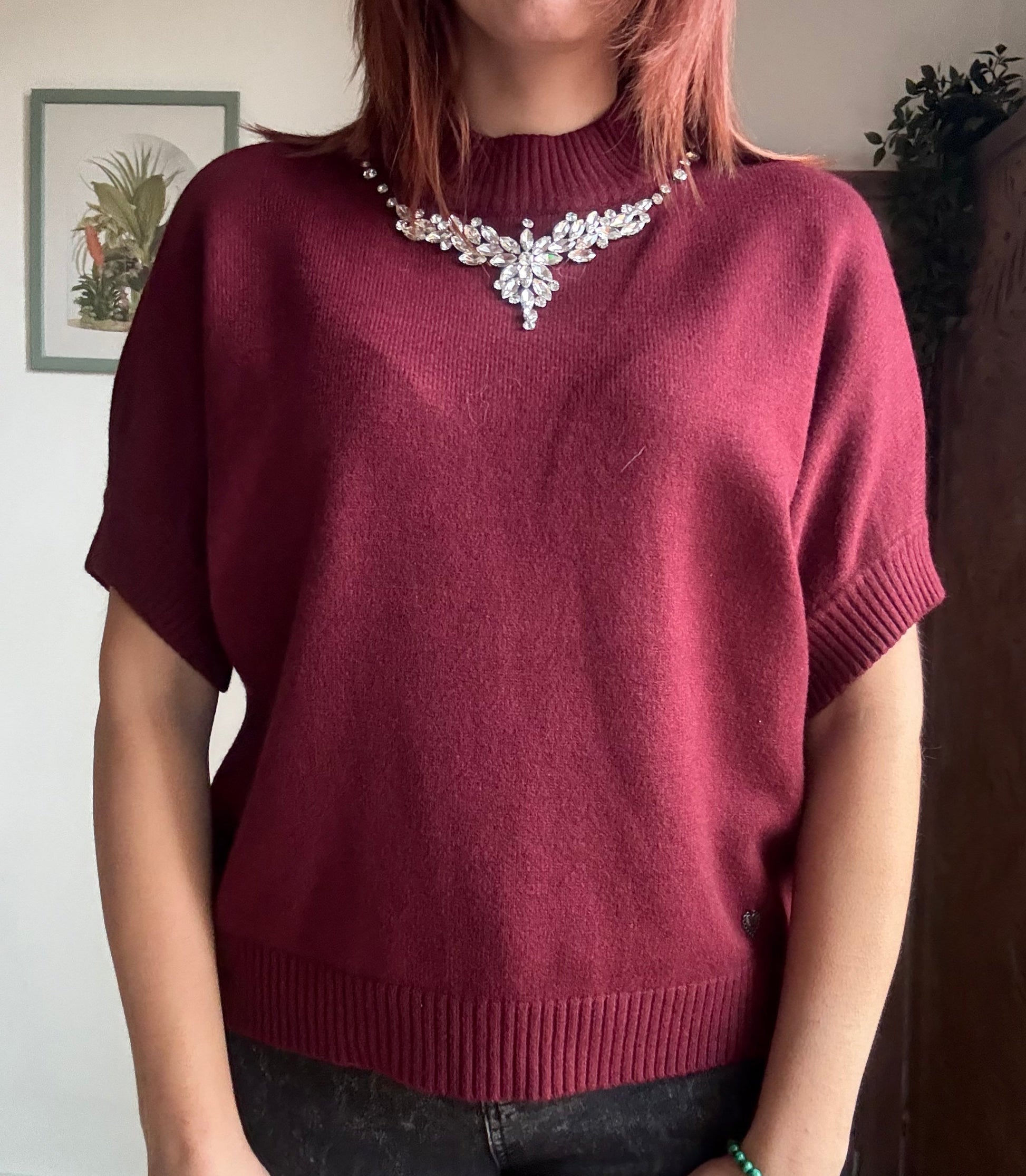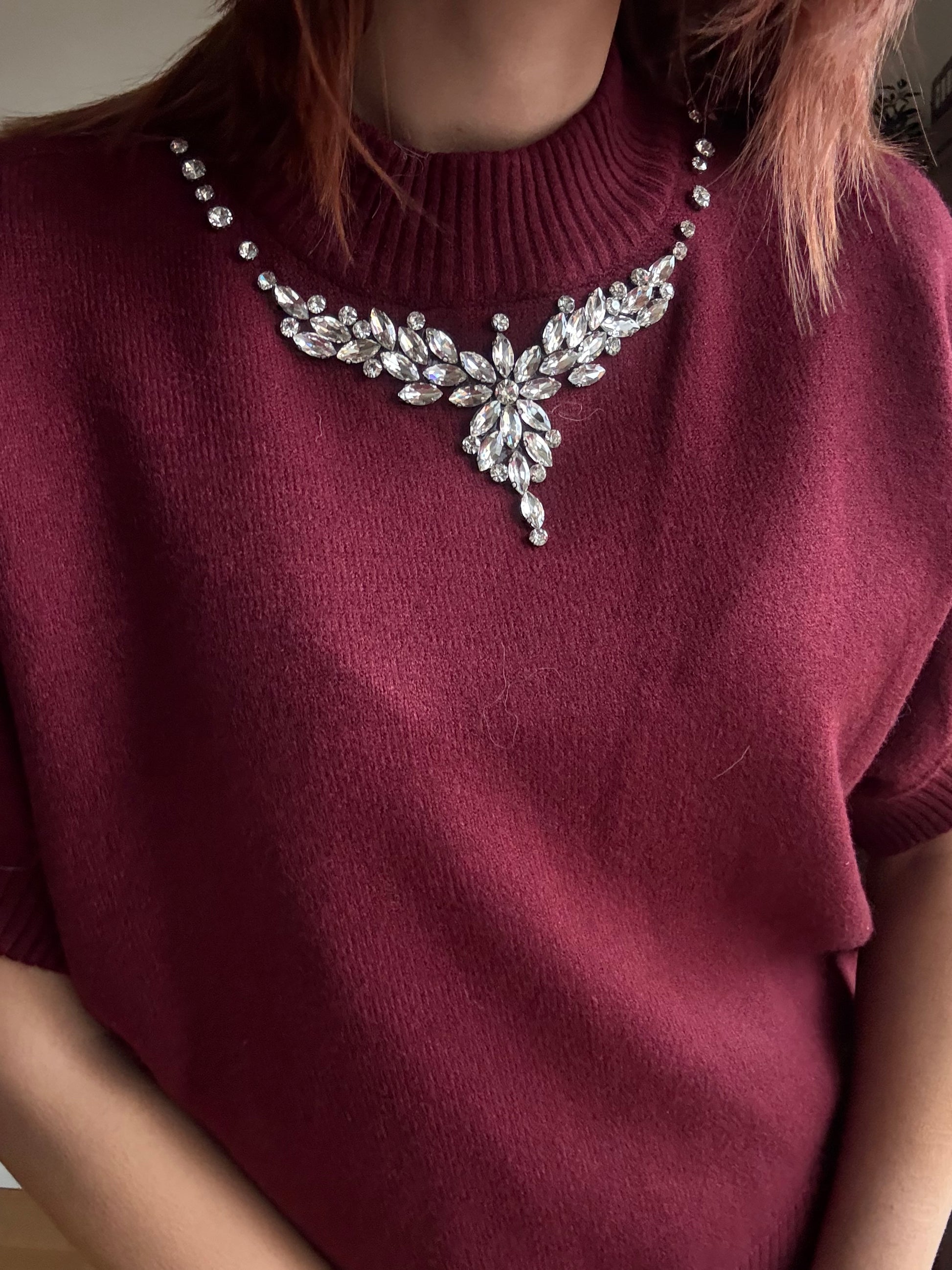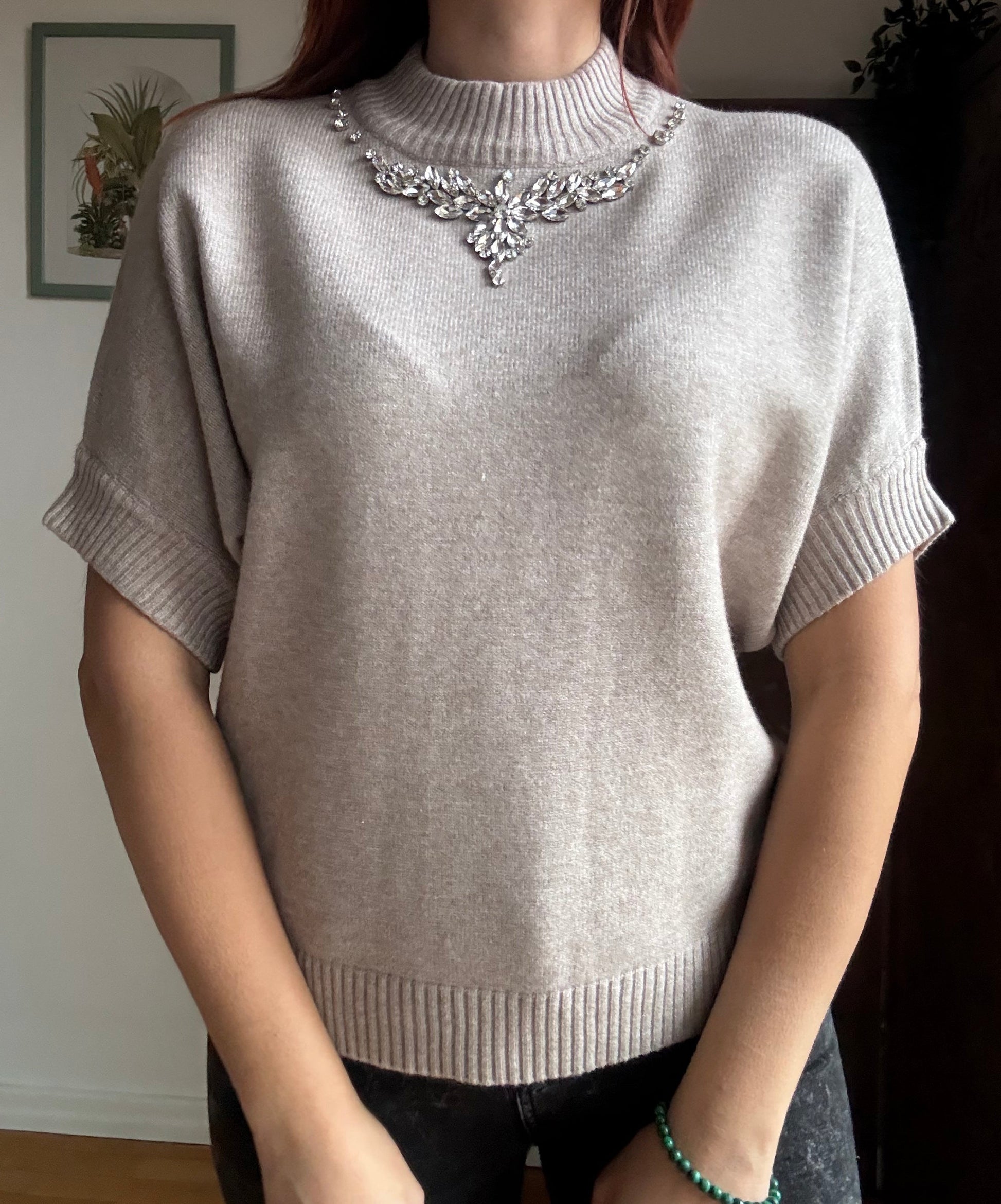 Raffinata e luminosa, questa maglia unisce la comodità con l'eleganza. In morbido tessuto, presenta un collo alto a cosstine con dettaglio gioiello e maniche corte ampie e morbide. Indossata sotto a un blazer o a un cardigan permette al gioiello di fare la sua figura.
