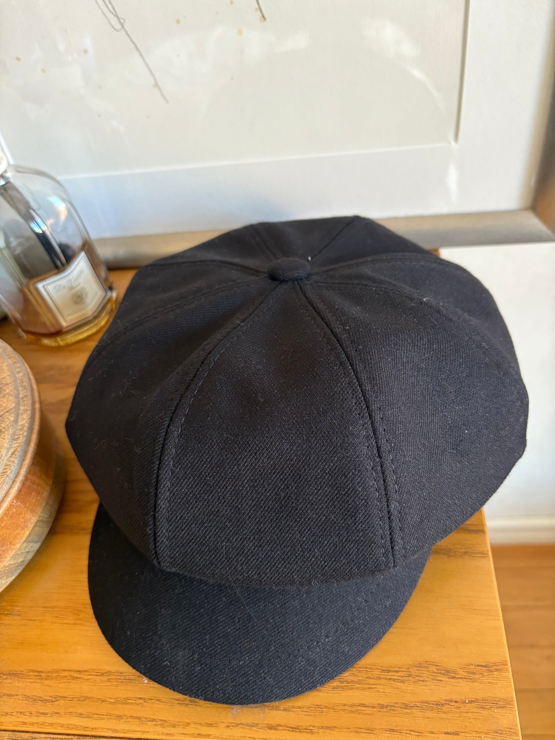 Cappello in stile inglese con visiera. La taglia si regola tramite due laccetti da legare all'interno.