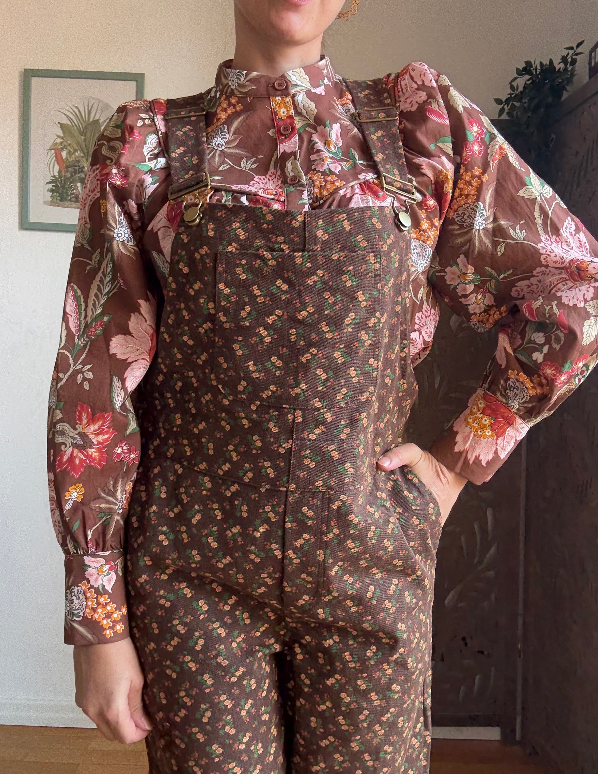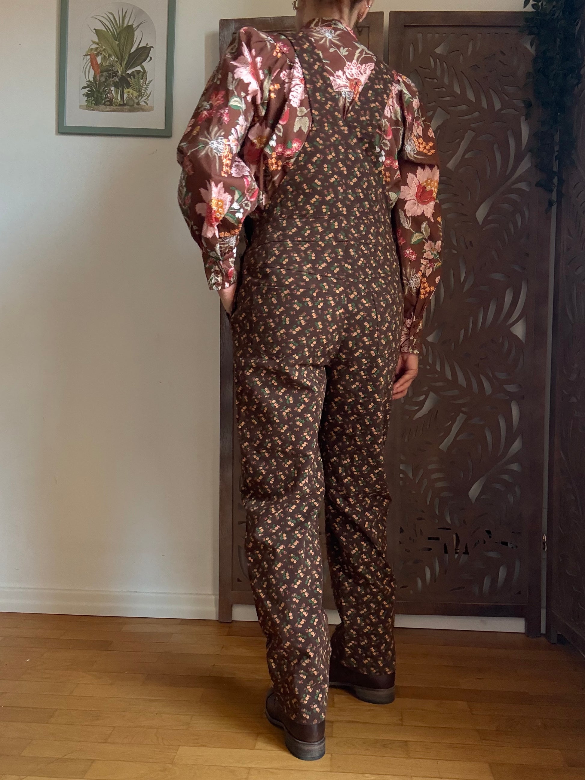 Salopette francese lunga in jeans marrone con stampa floreale e tasche. Ha bretelle regolabili e tre bottoni laterali su ogni lato a chiusura.